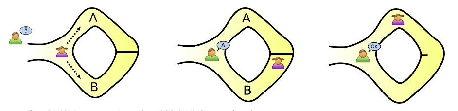 Bob 进入山洞,随机选择 A 或 B 作为他想让 Alice 返回的路径名称并大喊: