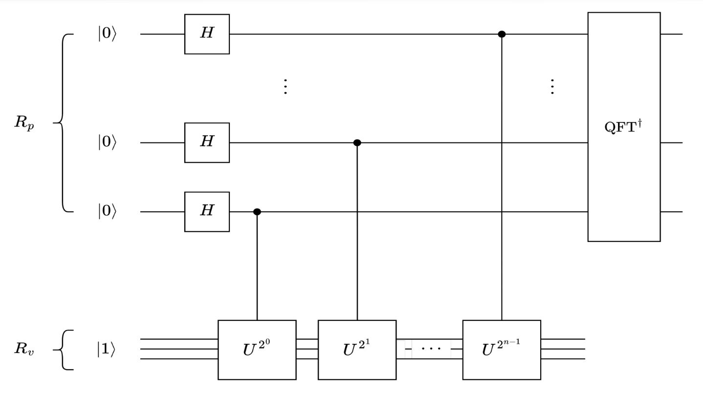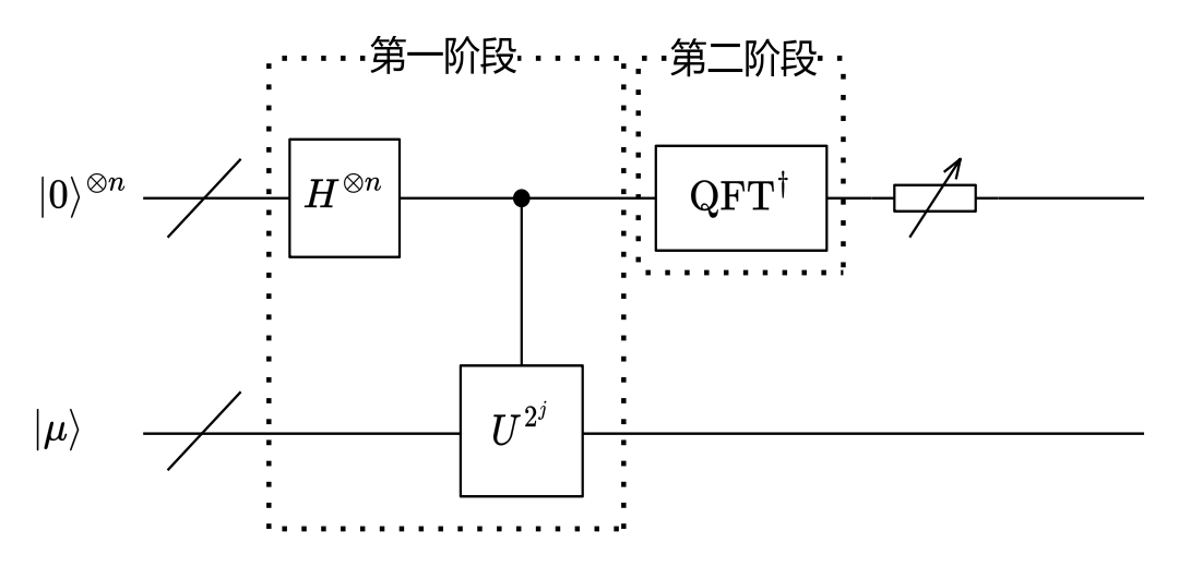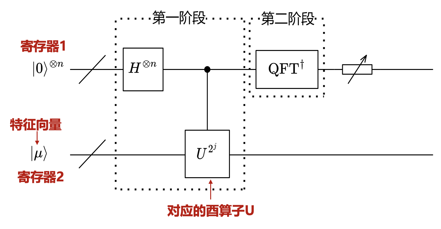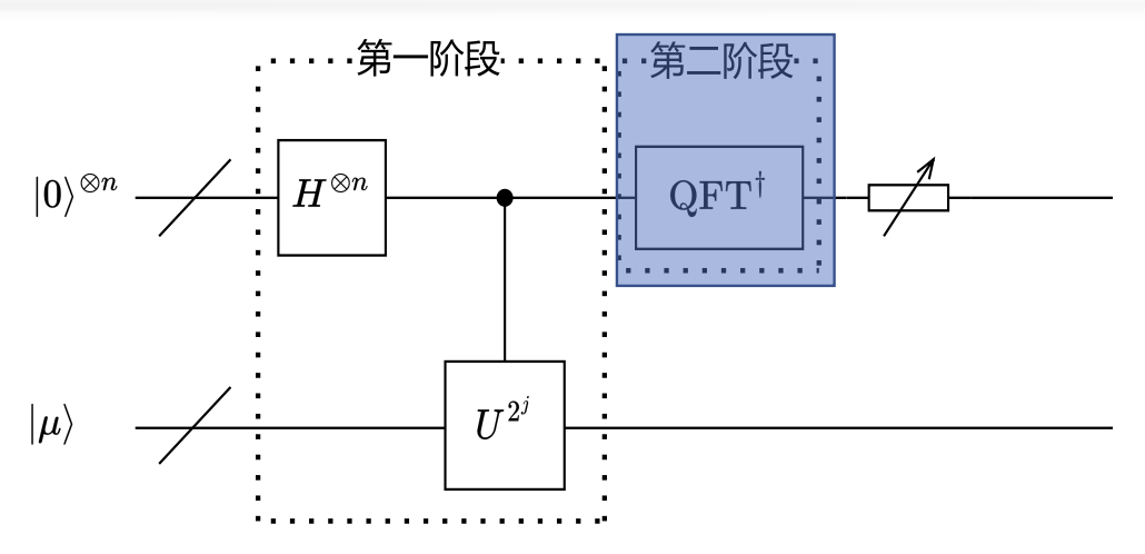 - 初始化:准备两个量子寄存器,一个存储相位估计结果,另一个存储本征态 \(|u\rangle\)