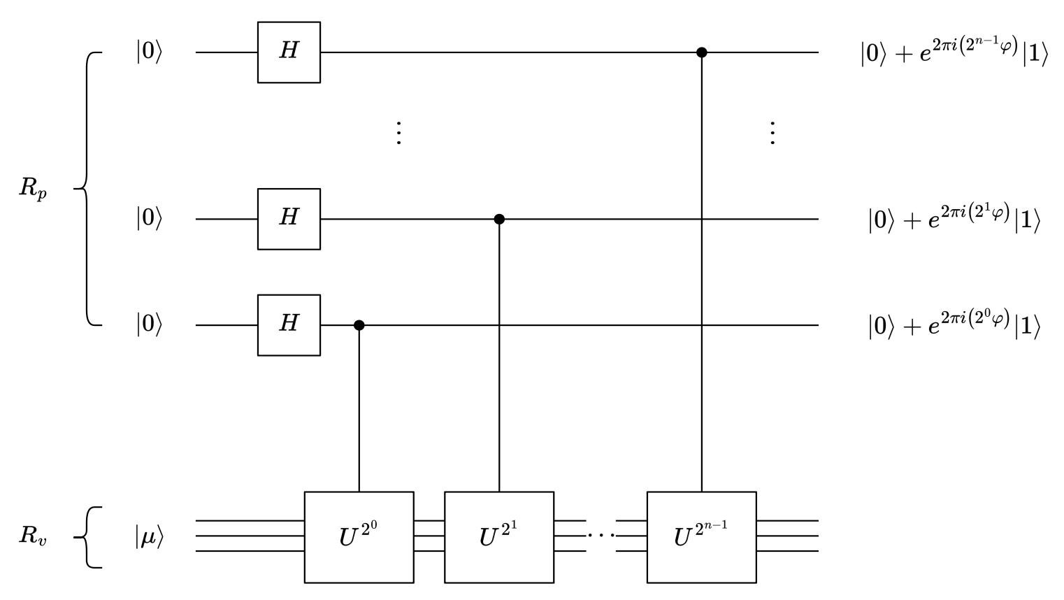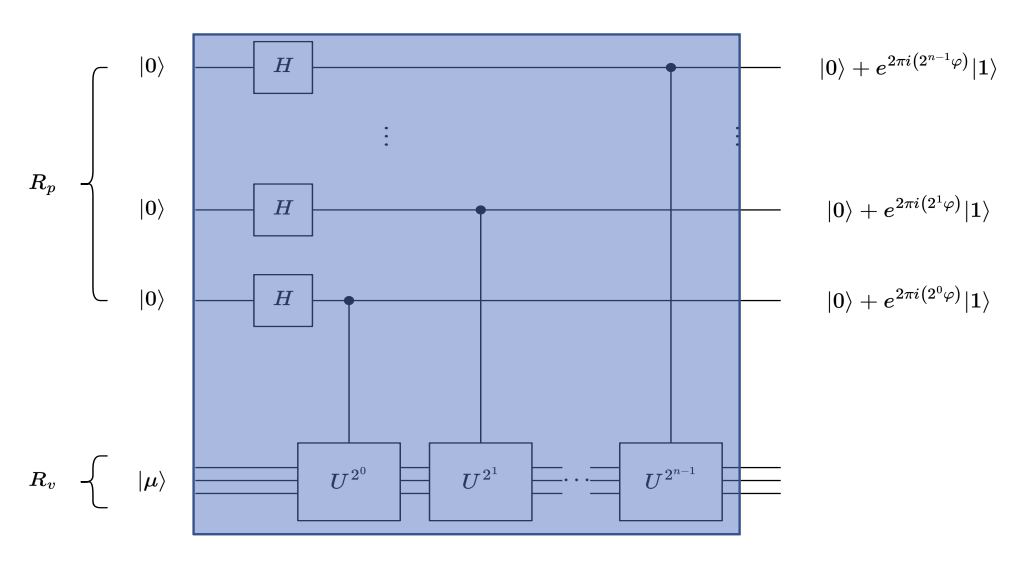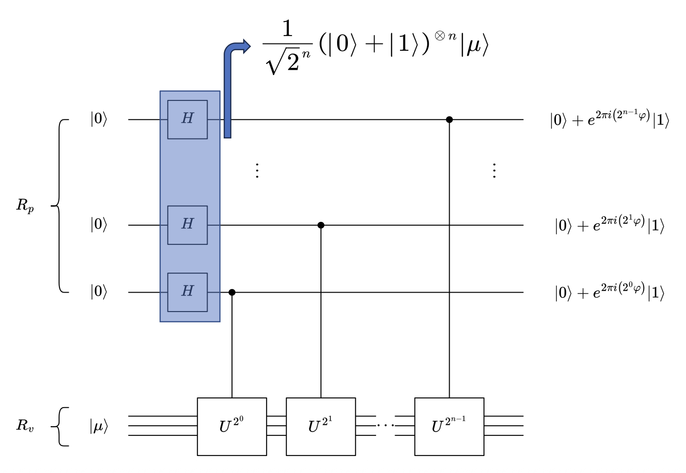 - 初始化:准备两个量子寄存器,一个存储相位估计结果,另一个存储本征态 \(|u\rangle\)
