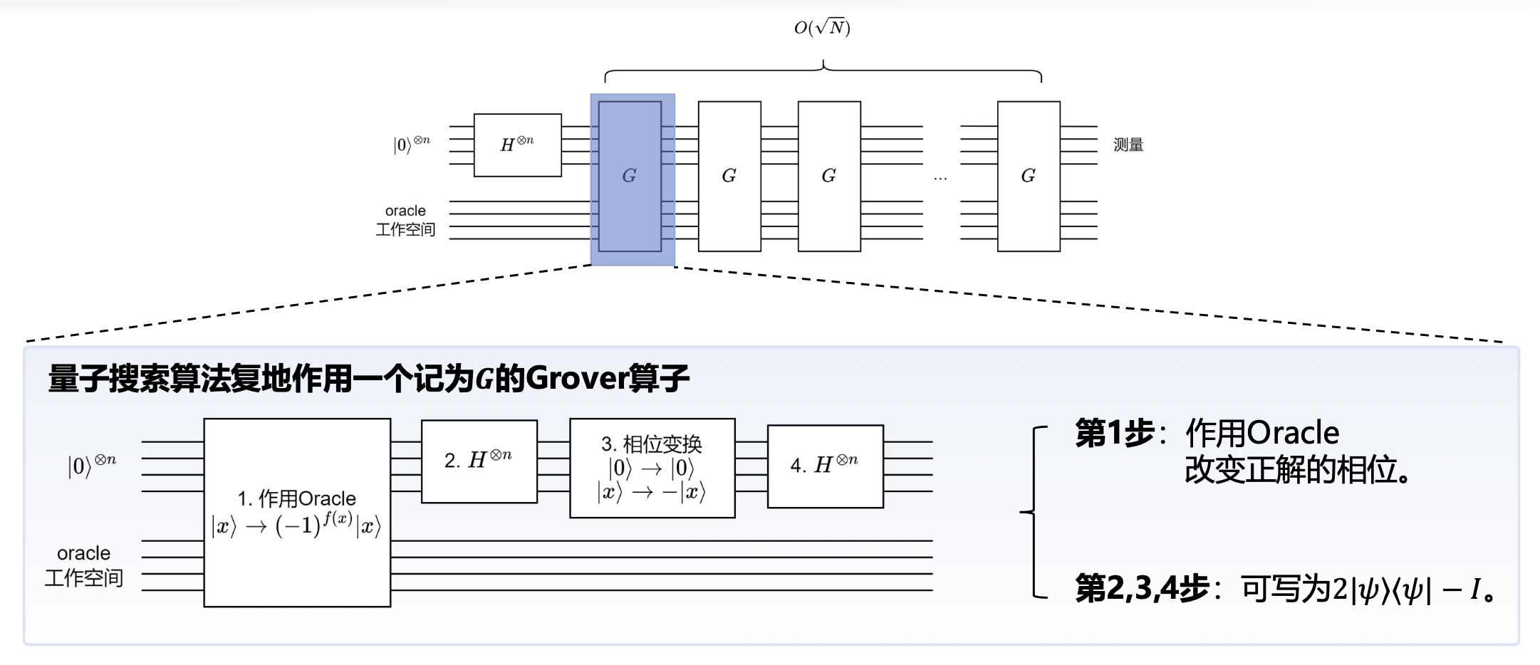 - 不同问题的 Oracle 电路不同,比如检验是否为 \(x\) 因子的电路、检验 \(x\) 是否小于一个常数 \(C\) 的电路,学习 Grover 算法不必纠结 Oracle 电路实现