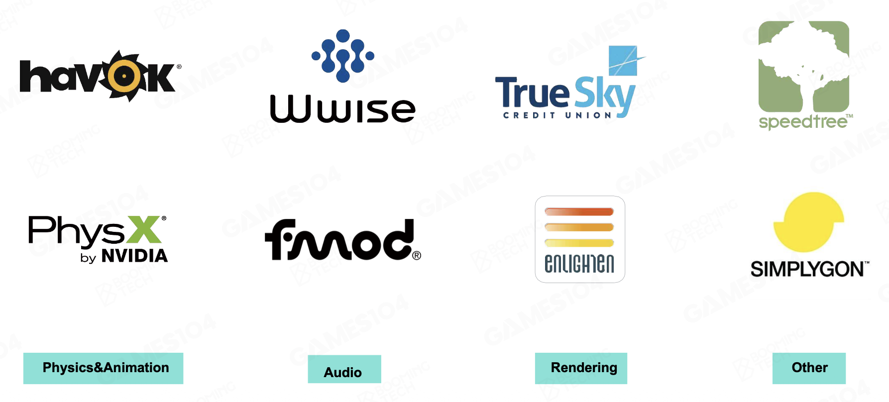 - 由于现在的游戏引擎越来越复杂,因此出现了这些专门做某个模块的中间件公司(