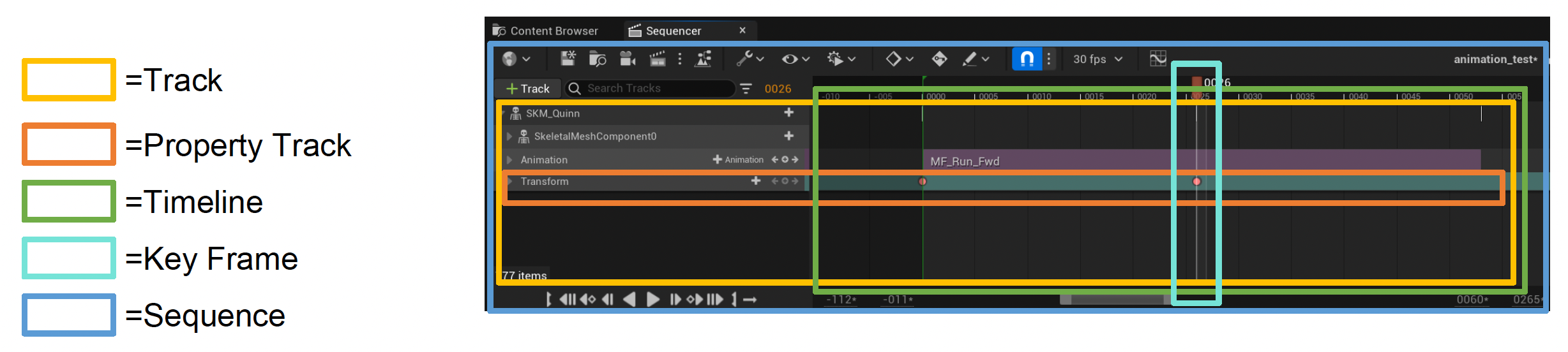 在 UE 中,这一任务由一个叫做序列器(sequencer) 的工具完成。它的组件有: