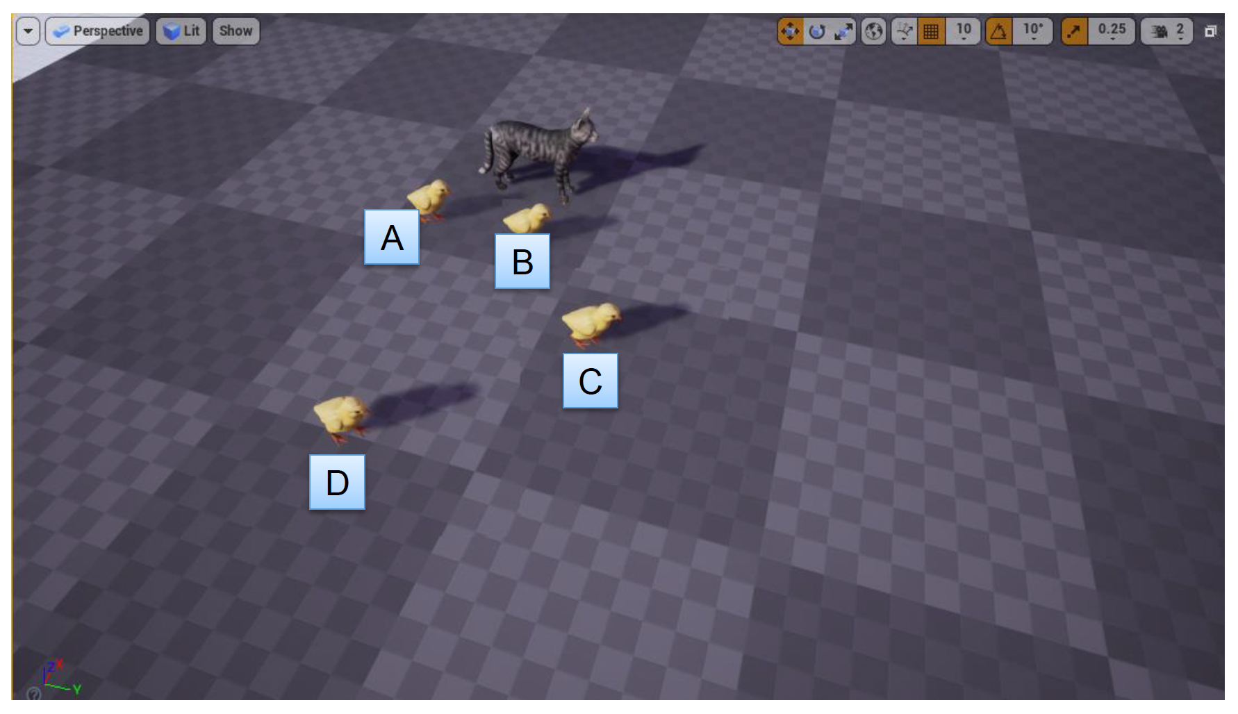 多个(使小鸡按 A -> B -> C -> D 的顺序行进)