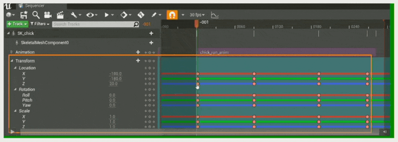 - 轨道(track):用于引用序列中的参与者;任何角色、道具、相机、效果或其他参与者都可以在序列器中被引用和操作