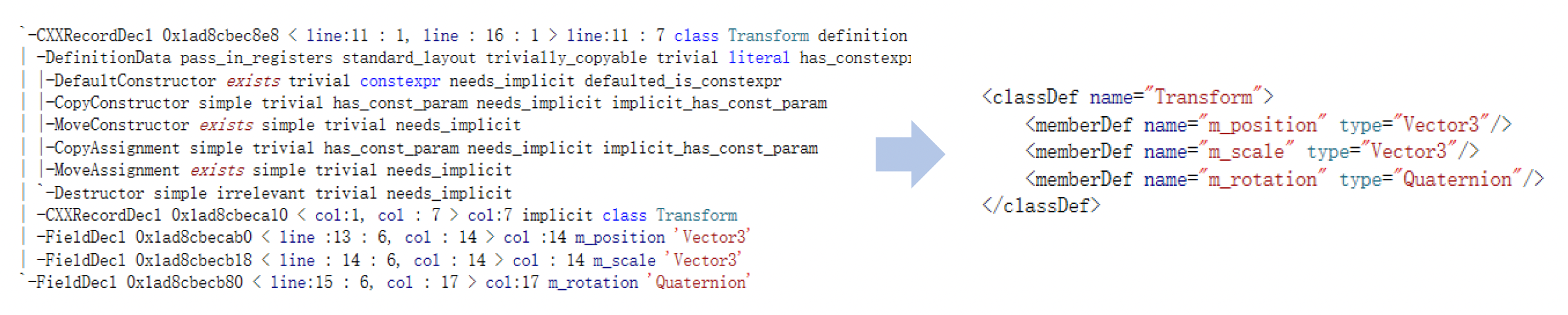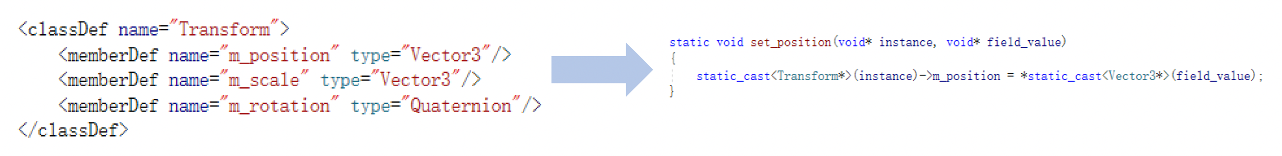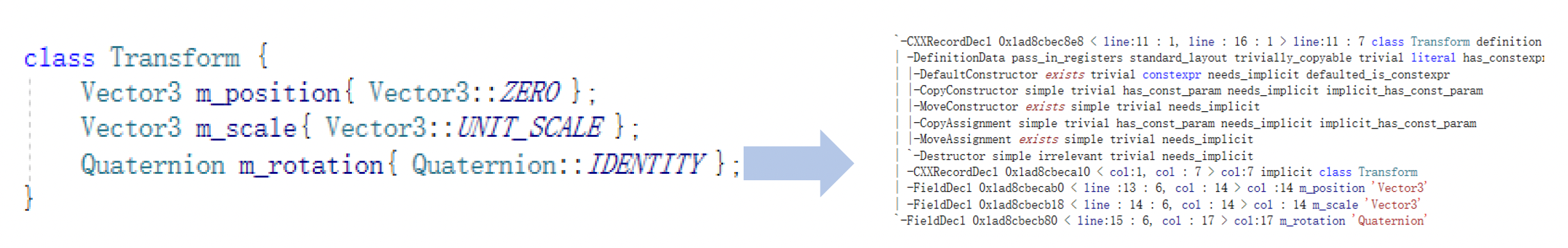 CLASS(Transform, Fields) { public: Vector3 m_position { Vector3::ZERO }; Vector3 m_scale { Vector3::UNIT_SCALE }; Quaternion m_rotation { Quaternion::IDENTITY }; }CLASS(CameraComponent : public Component, WhiteListFields) { public: CameraComponent() = default; META(Enable) CameraComponentRes m_camera_res; CameraMode m_camera_mode {CameraMode::invalid}; Vector3 m_foward {Vector3::NEGATIVE_UNIT_Y}; Vector3 m_up {Vector3::UNIT_Z}; Vector3 m_left {Vector3::UNIT_X}; };- 第一段代码中的