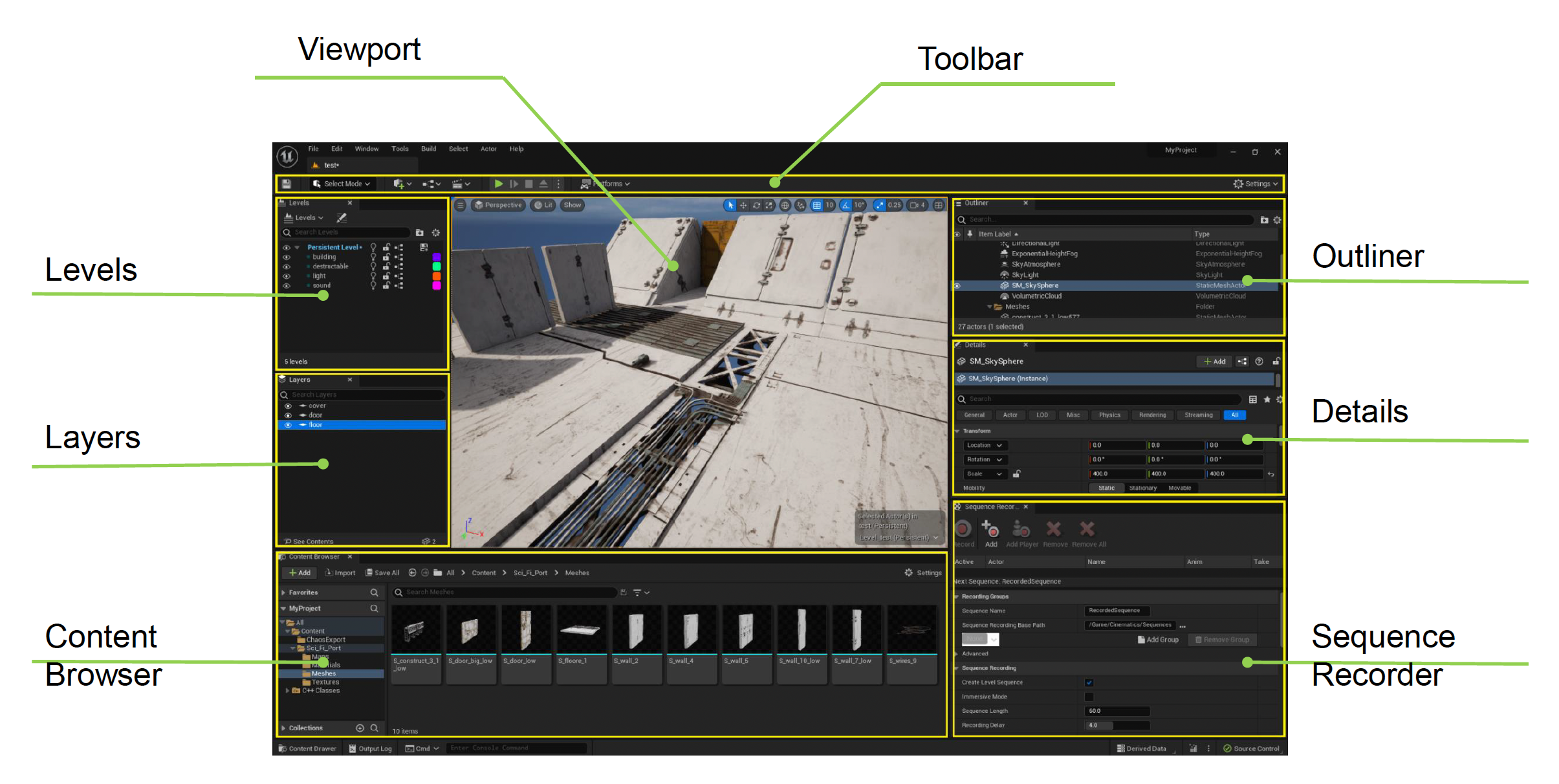 下面将详细讲解工具链中一个重要的工具——世界编辑器(world editor)。它的界面通常长这样(下图是旧版 UE 的关卡编辑器
