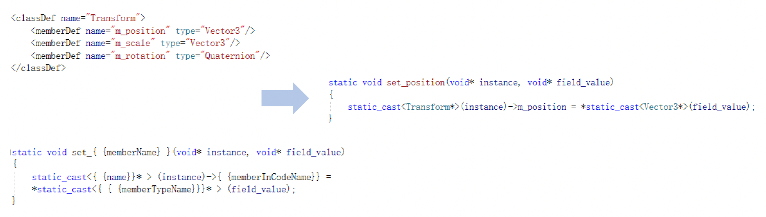 一个游戏引擎中需要反射的类会有几十个,如果还要手动写 getters, setters,那将是一件十分繁琐的事,并且不够自动化。为此引入了代码渲染(code rendering) 机制。它是收集数据(如有)和加载相关模板(或直接发送输出)的过程。然后将收集到的数据应用于相关模板中,最终将输出发送给用户。这样做的好处是实现代码和数据的分离。