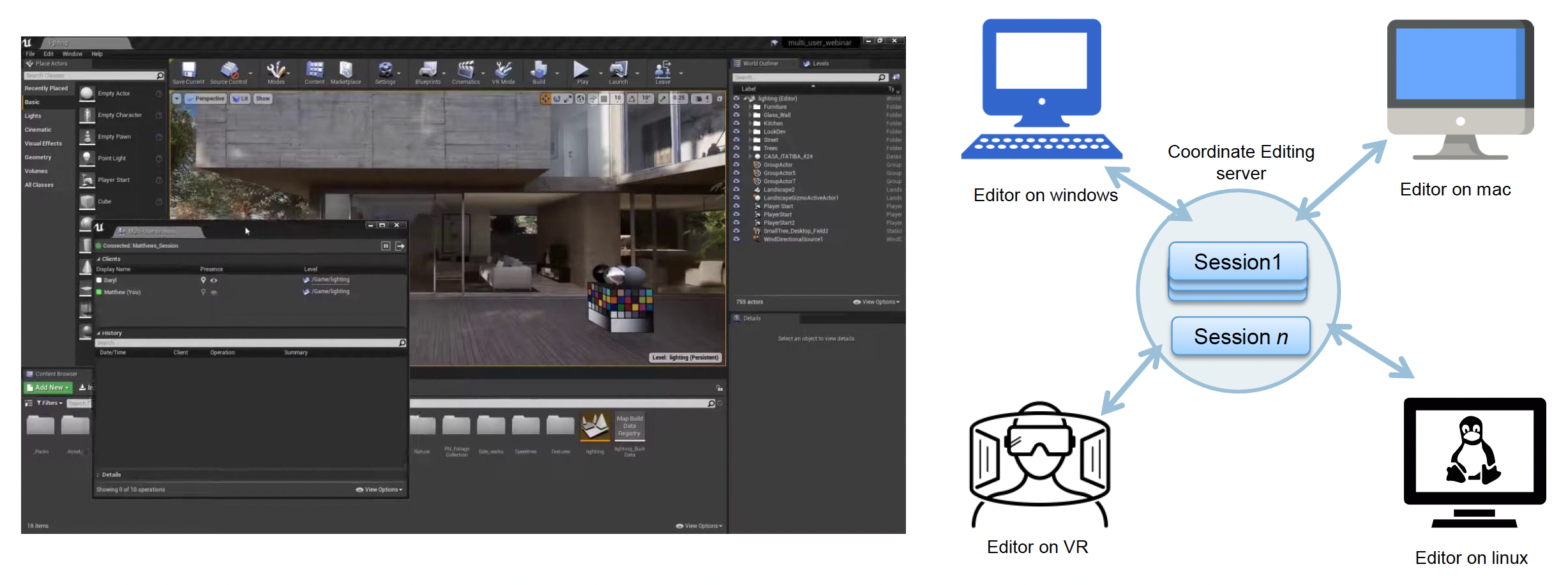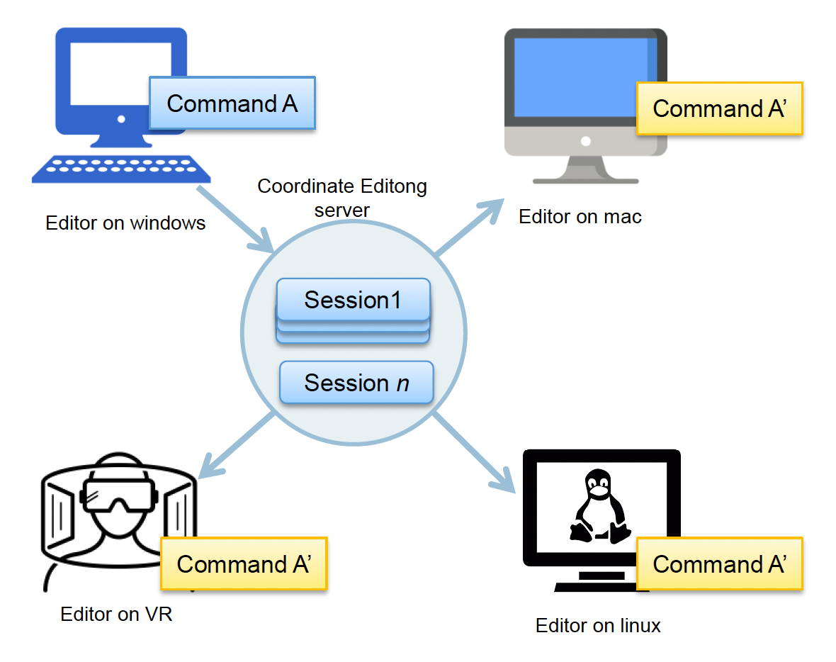 第二类解决冲突的方法是协同编辑,即连接多个世界编辑器实例,以在共享编辑会话 (sessions) 中协作,与团队成员实时共同搭建虚拟世界。