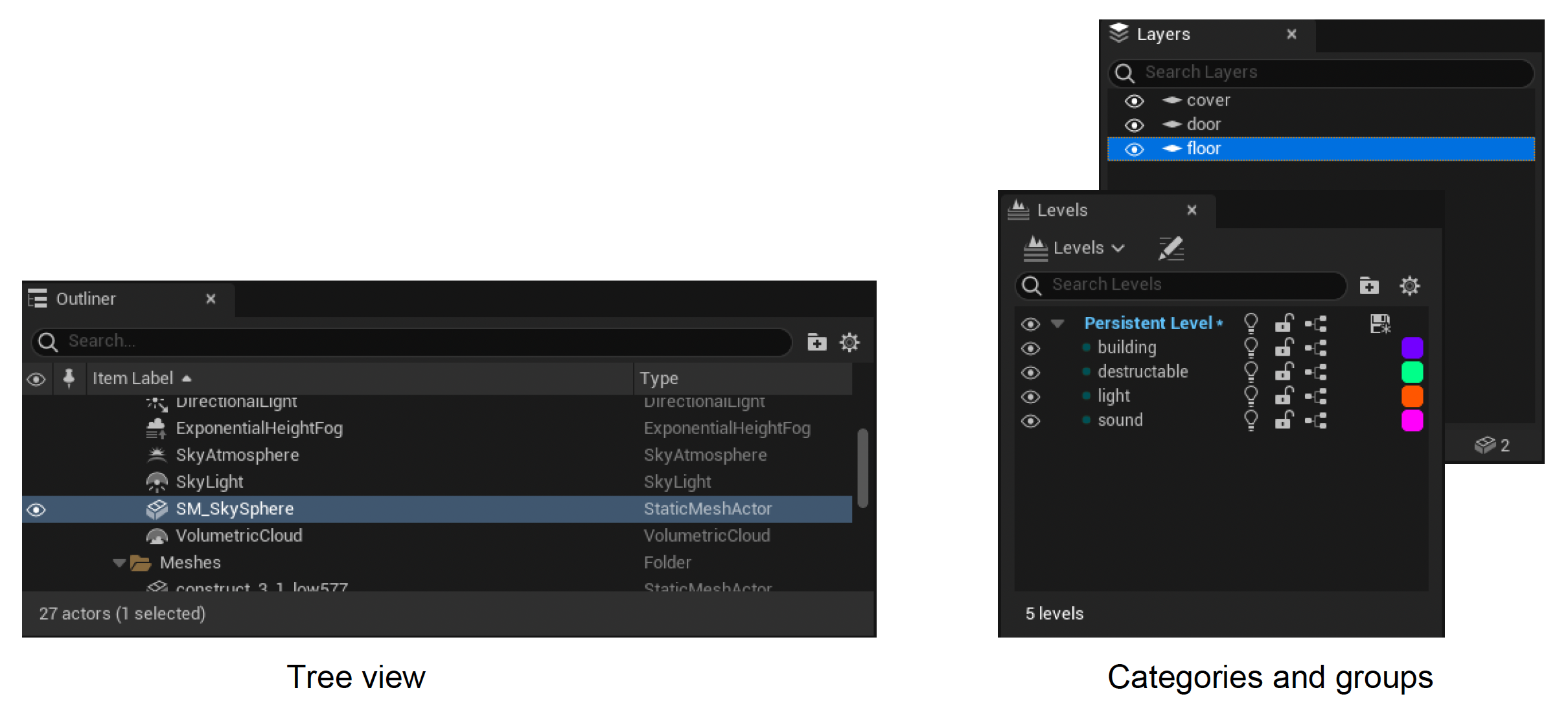 编辑器应当能显示场景中所有对象的信息。但对于一个大型游戏而言,场景中可能有成千上万的对象,因此以不同视图组织对象这件事就很重要,会为开发带来更多便利,比如提供树状视图、目录和分组等等。