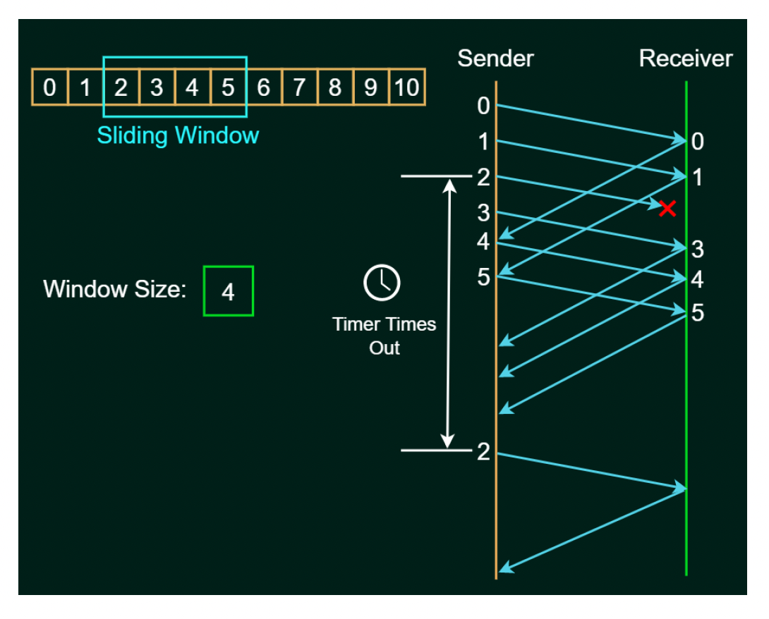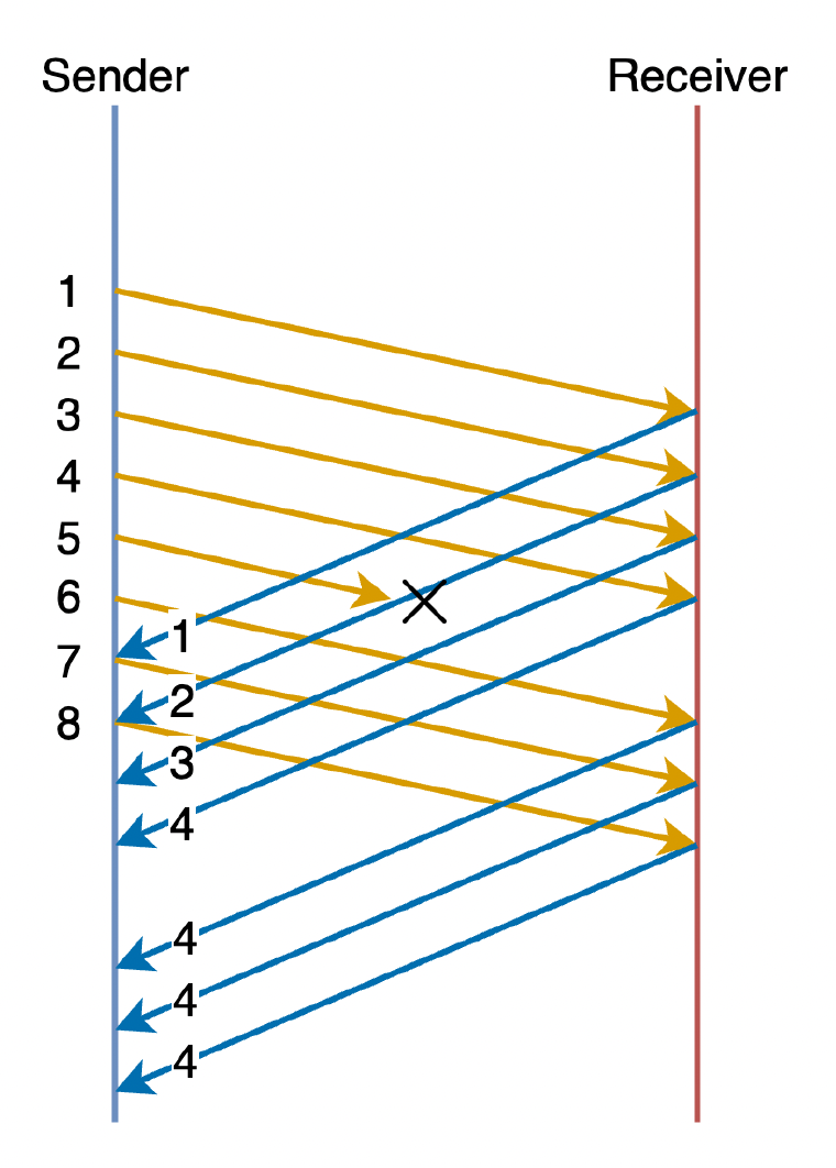 • 发送者发送数据包和序列号,比如 1, 2, 3, 4, 5, 6, 7, 8