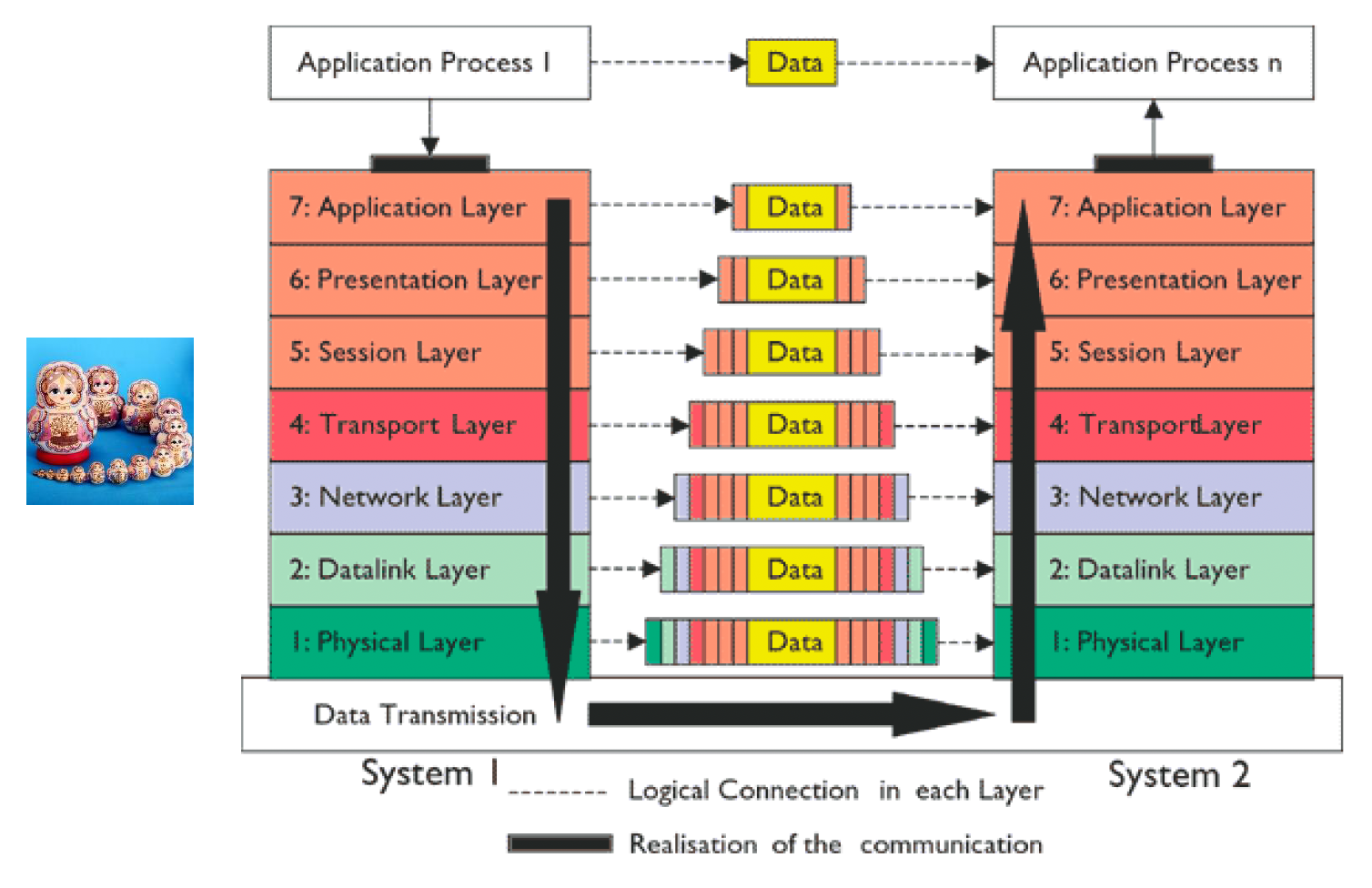 一种经典的分层方法是 OSI 模型,它将中间层分为 7 层,自顶向下包括: