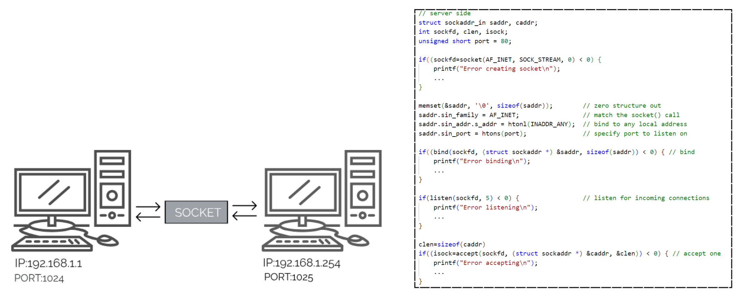 例子:int sockfd = socket(AF_INET, SOCK_STREAM, 0)