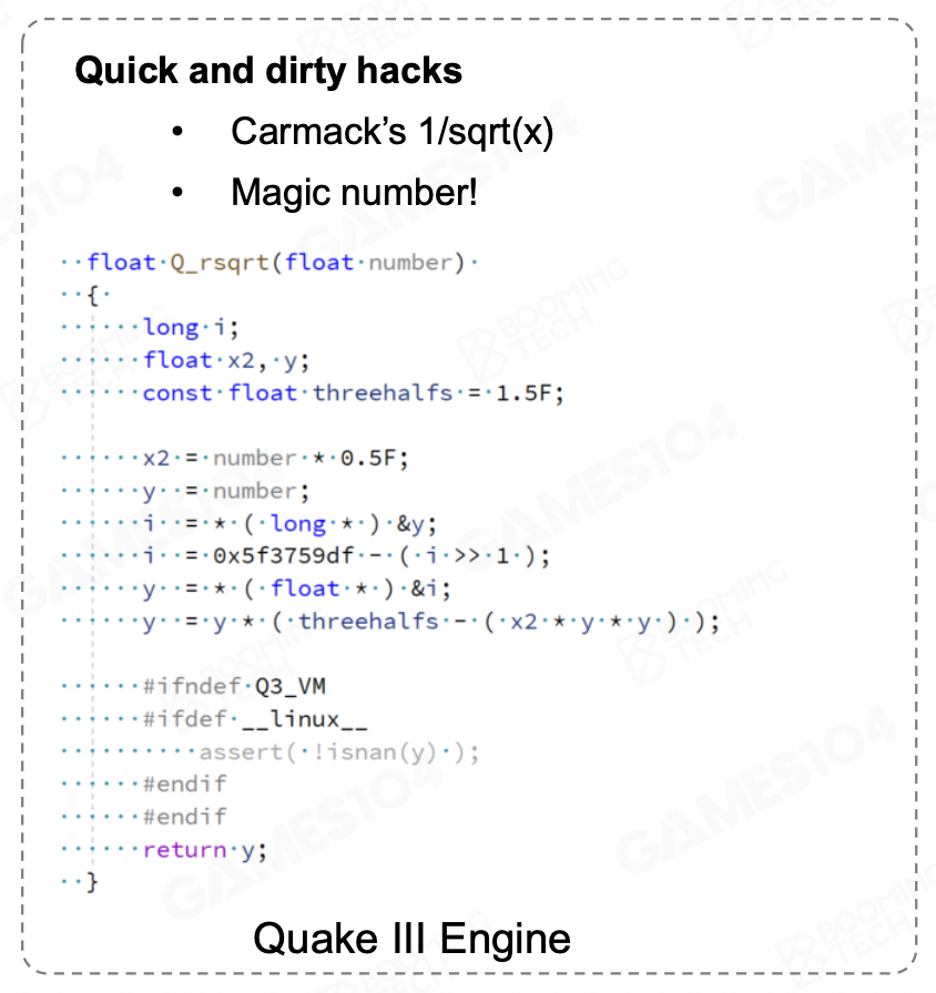 一些 hack,比如卡马克在开发 Quake 时使用牛顿迭代法近似计算 \(\dfrac{1}{\sqrt{x}}\)(本来会涉及到大量耗时的浮点运算)
