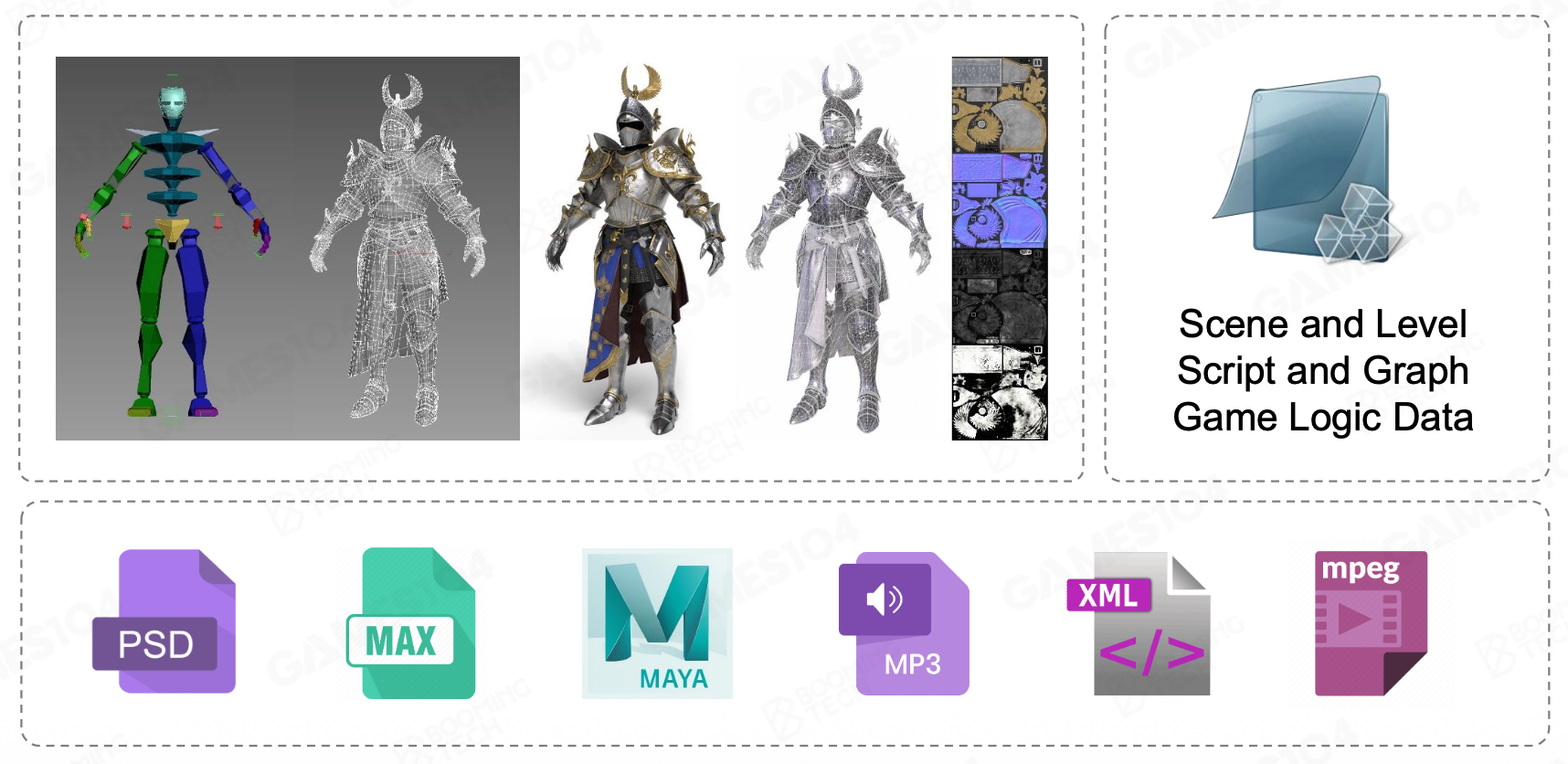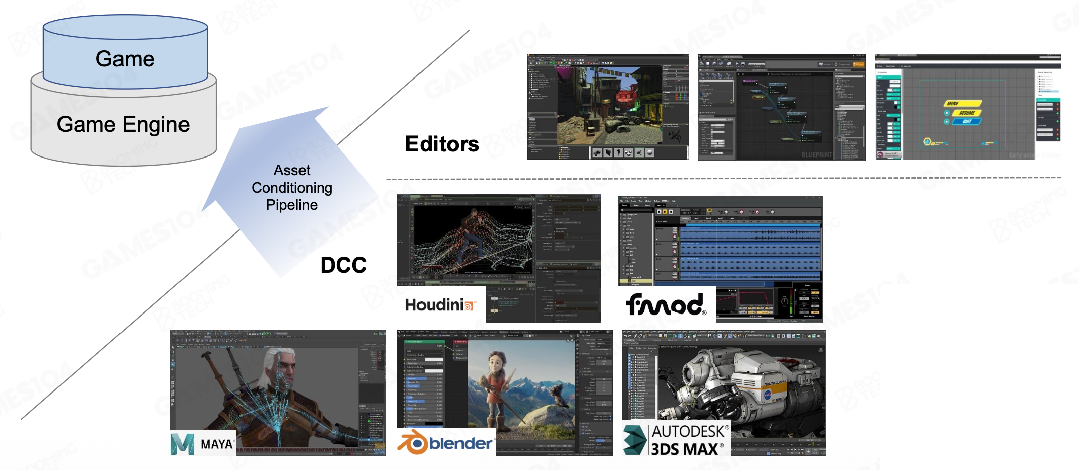 - 资产调理管线(asset conditioning pipeline):将通过别人开发的资产生产工具生成的大量数字资产和我们自己编辑生成的数字资产通过一条管线全部变成游戏统一的资产