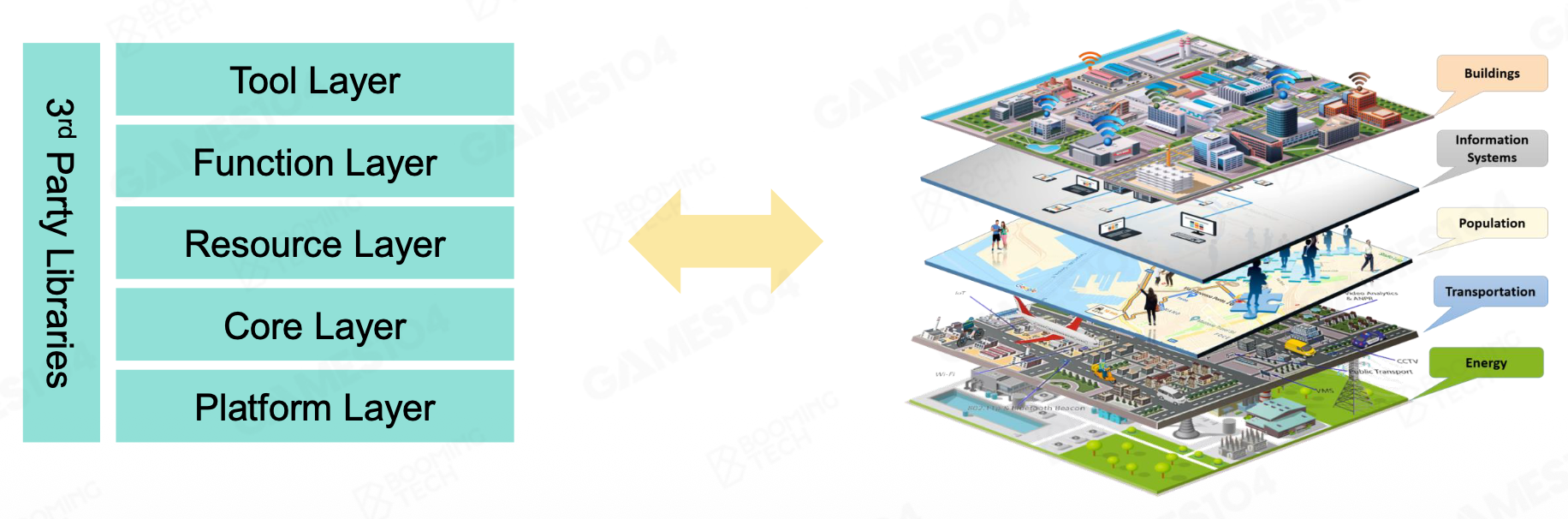 本节将介绍游戏引擎的分层结构(layerd architecture),从而对游戏引擎有一个整体的认识和理解。自顶向下来看,游戏引擎可分为以下五个层级: