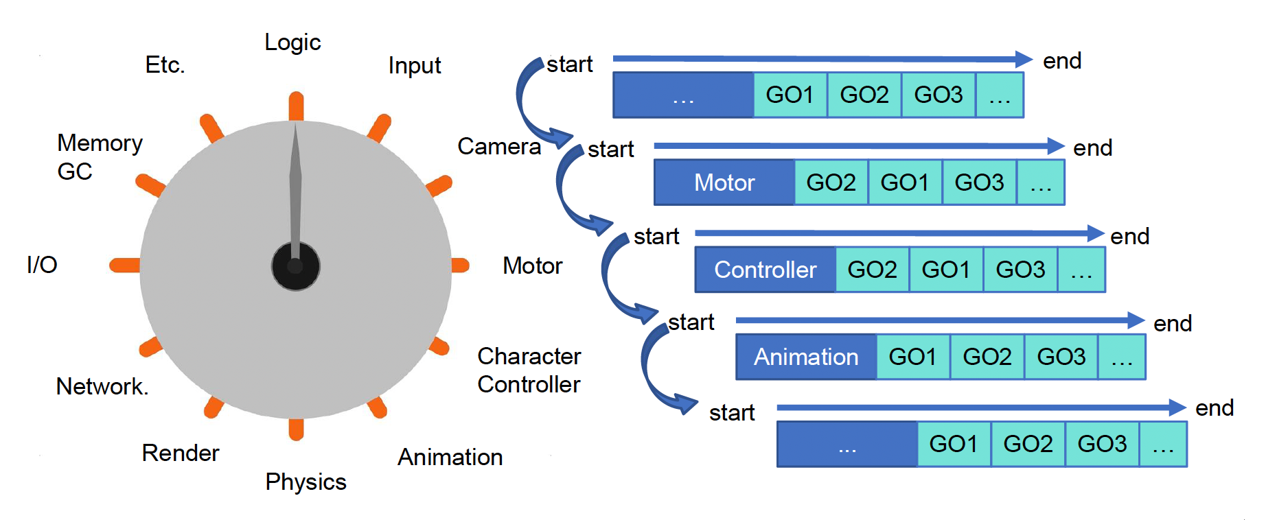 但在现代游戏引擎中,我们采用的不是这种思路,而会用一种基于组件的 tick,依次 tick 每个组件。比如先 tick 完所有 GO 的马达系统,然后再去 tick 所有 GO 的控制器,以此类推。
