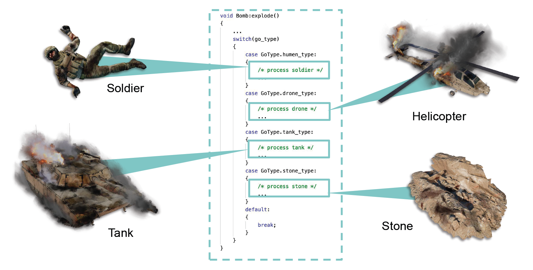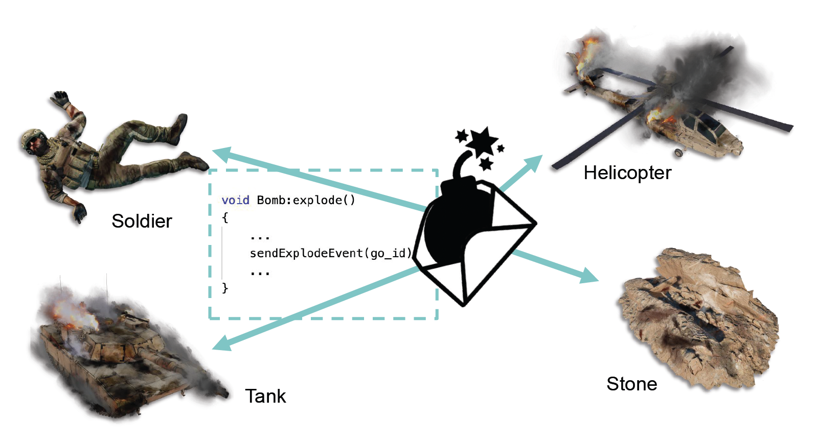 但随着游戏世界越来越复杂,人们会发现这种方法不太合理,于是就有了现代游戏引擎中最重要的机制之一:事件(event) 机制。对于前面炮弹的例子,炮弹在爆炸时无需在意周围有什么对象,它只需要发送一条消息,告诉其他对象说它要爆炸了;其他对象接收消息后会根据实际情况做相应的处理,比如说炮弹附近的小兵收到消息后血量就会下降,甚至可能死亡。