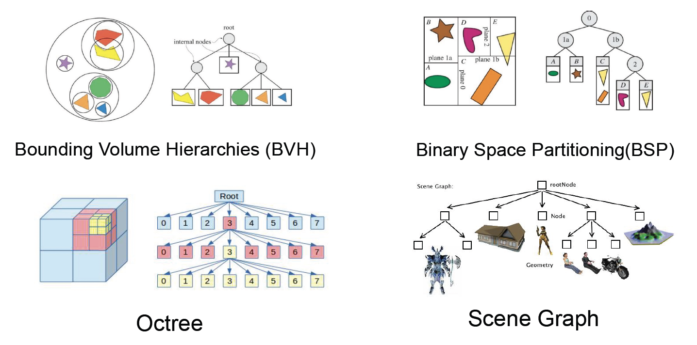 - 每一个物体都对应一个包围盒,把它从小往大慢慢的做一些计算(比如最常见的视锥裁剪)