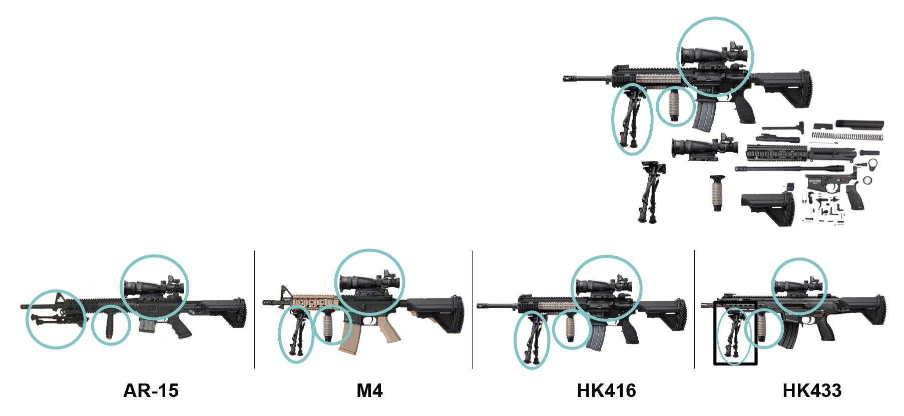 解决方案是将对象组件化——把一个游戏对象拆分成多个组件(components)。比如在射击游戏中,一把枪可以有像瞄准镜、消音器、握把、支架等组件。通过不同的组合(composition),我们便可得到不同特性的武器了。