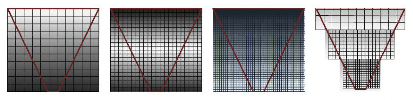 另一种较为激进的方法是不规则三角网(triangulated irregular network, TIN)。其核心思想是:放弃规则网格,针对地形特征进行非均匀采样:在平坦区域使用极大的三角形,在陡峭区域使用细碎三角形。