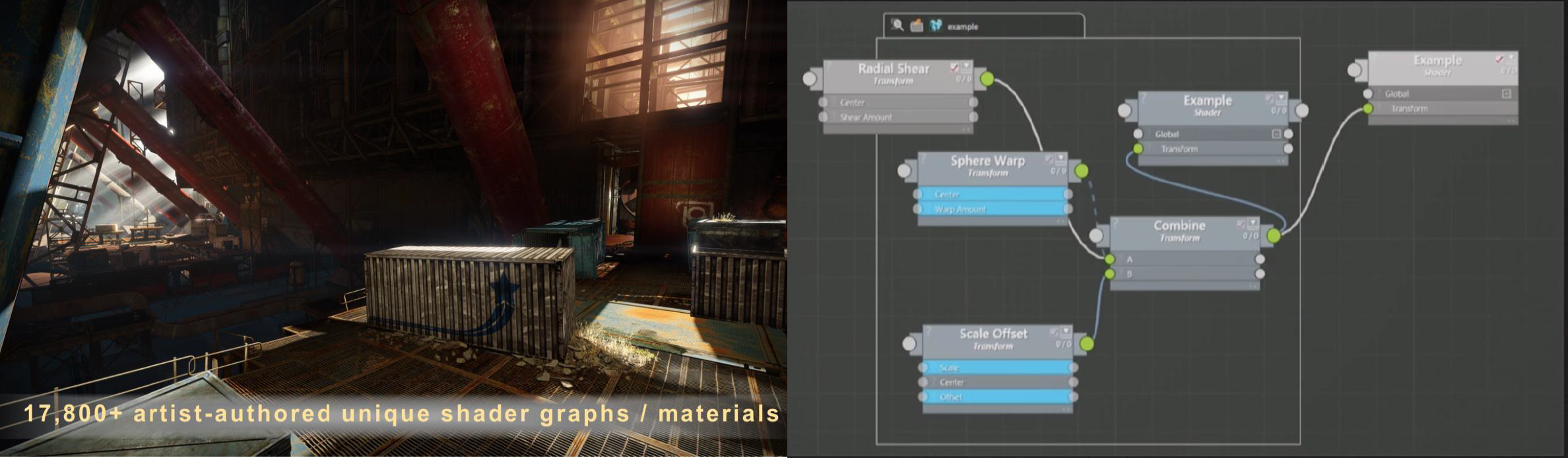 除了固定的着色器函数这一传统形式外,在现代游戏引擎中有一种叫做着色器图(shader graph) 的工具。艺术家们可以像搭积木那样自由组合各种元素,最终形成完整的 shader 代码以表达所需要的材质。