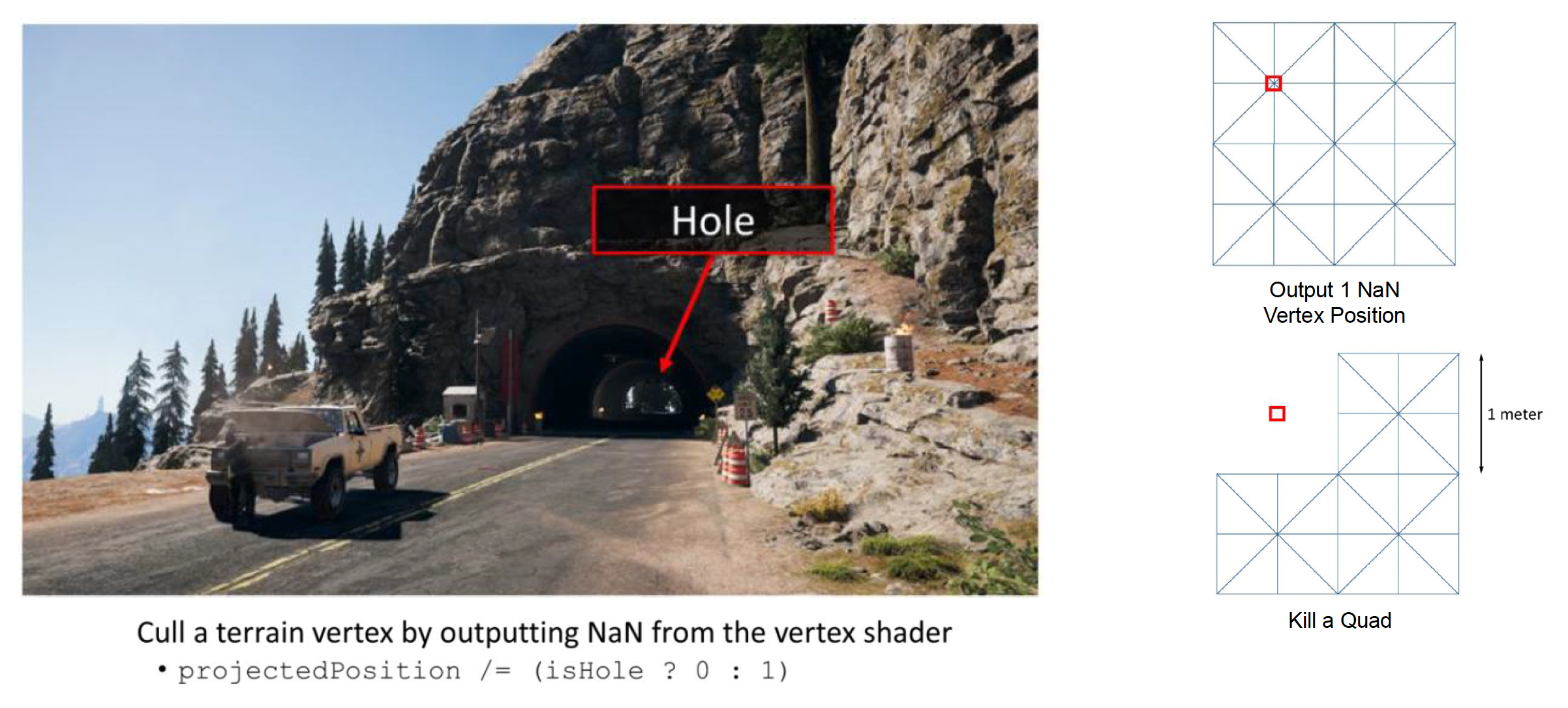 - 在着色器中,如果检测到某区域被标记为“洞”,则输出 NaN 坐标,或执行丢弃操作,从而让 GPU 剔除该区域的三角形