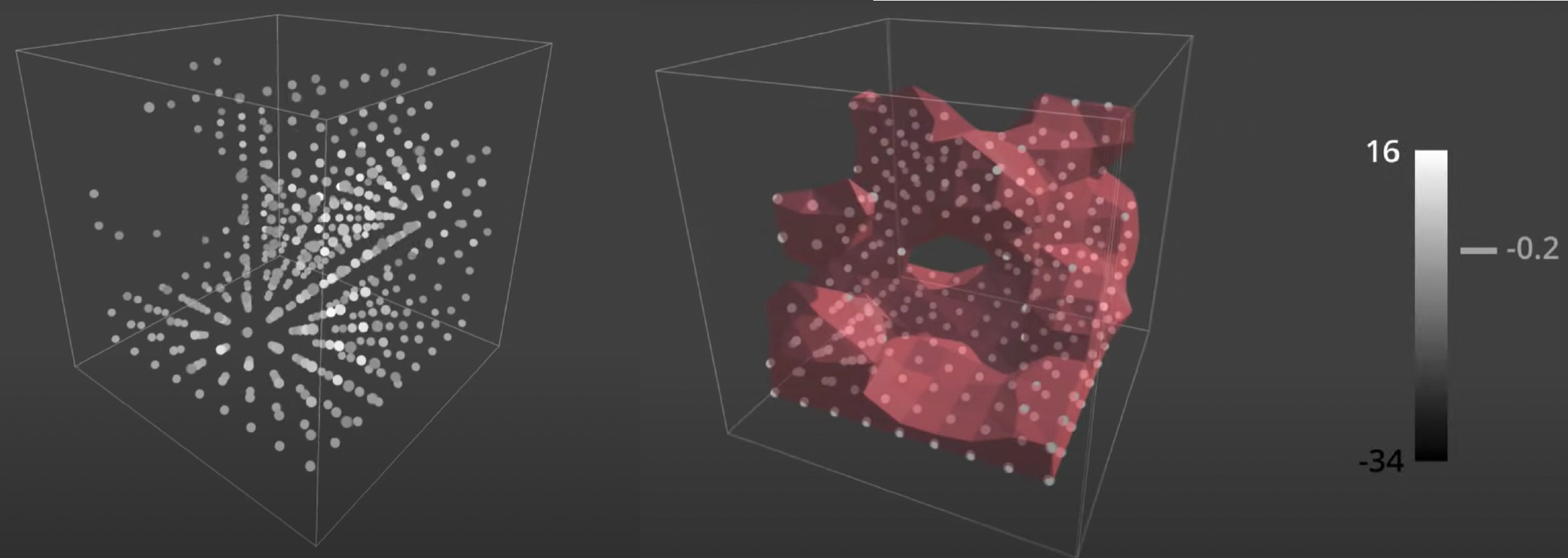 - 算法遍历每个立方体,根据 8 个顶点的密度状态(在表面内或外