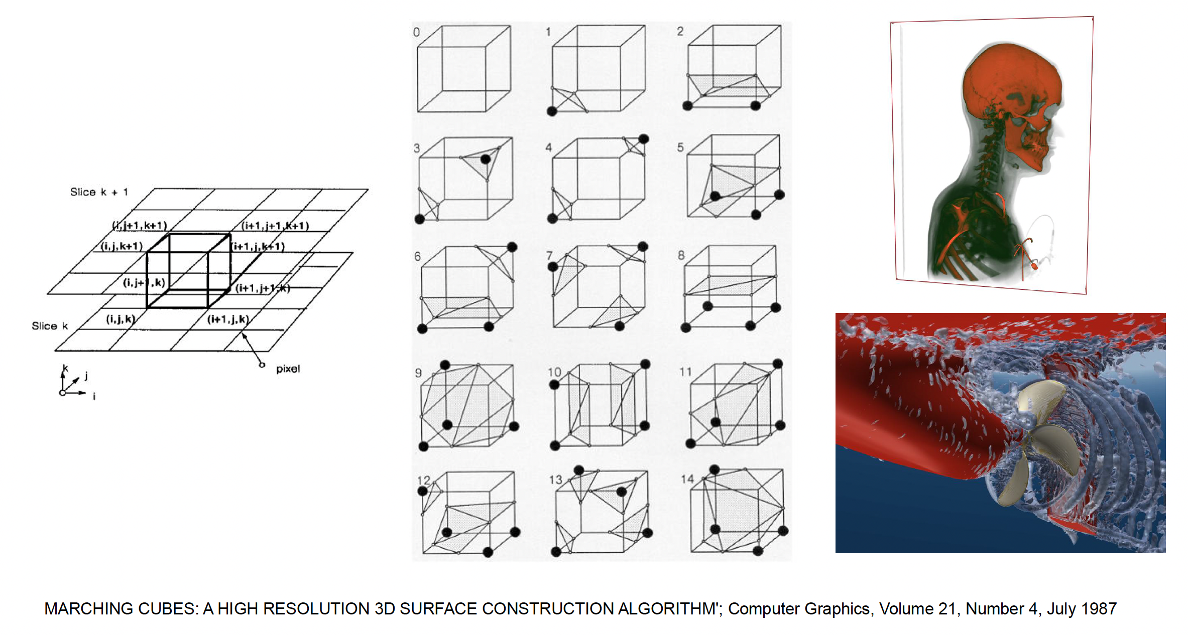 ) ,查找预计算的边缘表,生成穿过该立方体的三角面片(14 种) - 应用:CT 扫描生成的图片、可视化螺旋桨的速度场、数字人等
