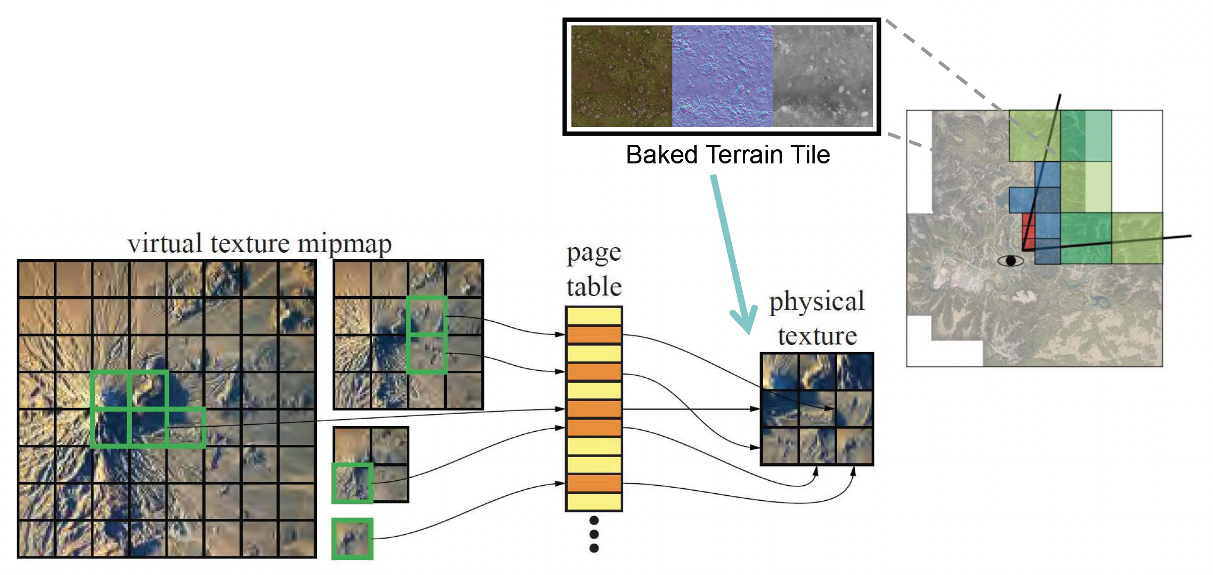 鉴于上述问题,再加上游戏画质的日益提升,我们亟需一种解决方案——这个方案就是虚拟纹理(virtual texture),它借鉴了操作系统中的虚拟内存的实现思路。