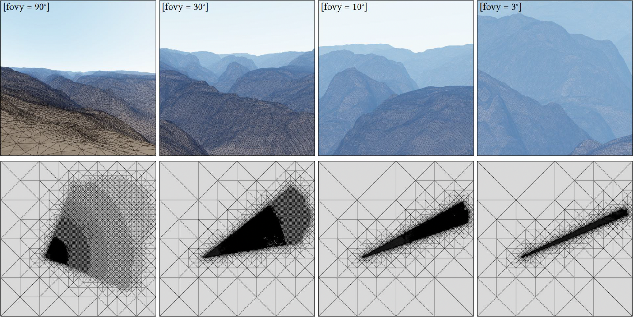 - 如下图所示,当 FoV 越来越窄时,三角形会切分得越细密,因为我们看到的东西在放大