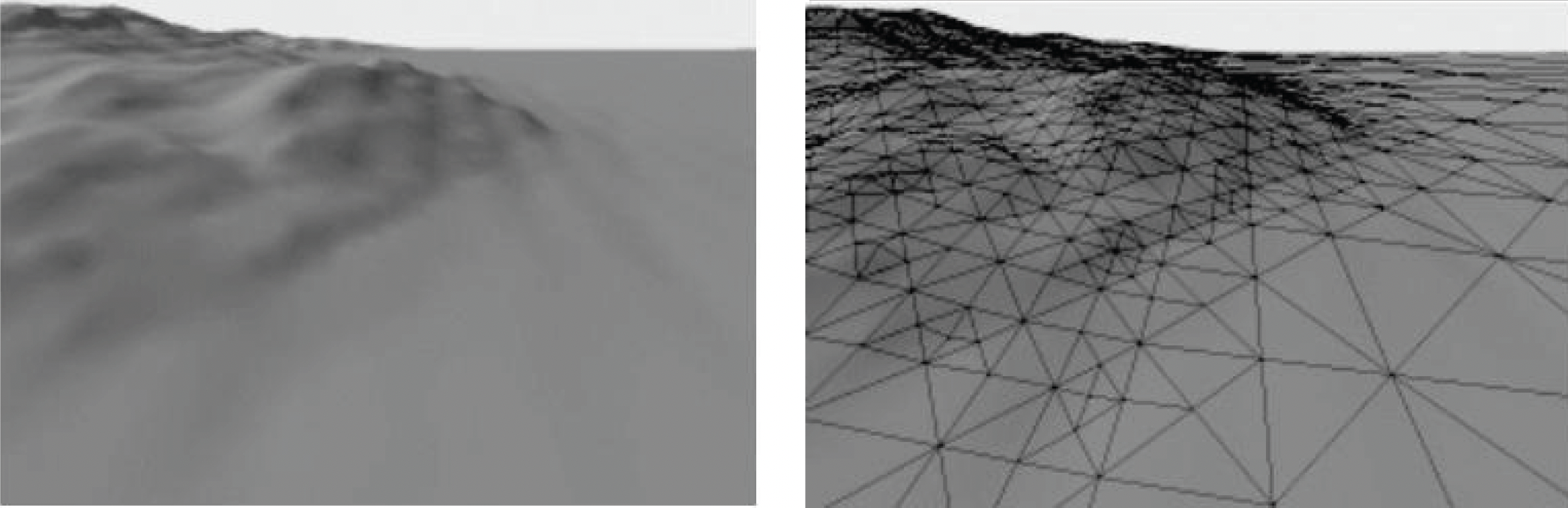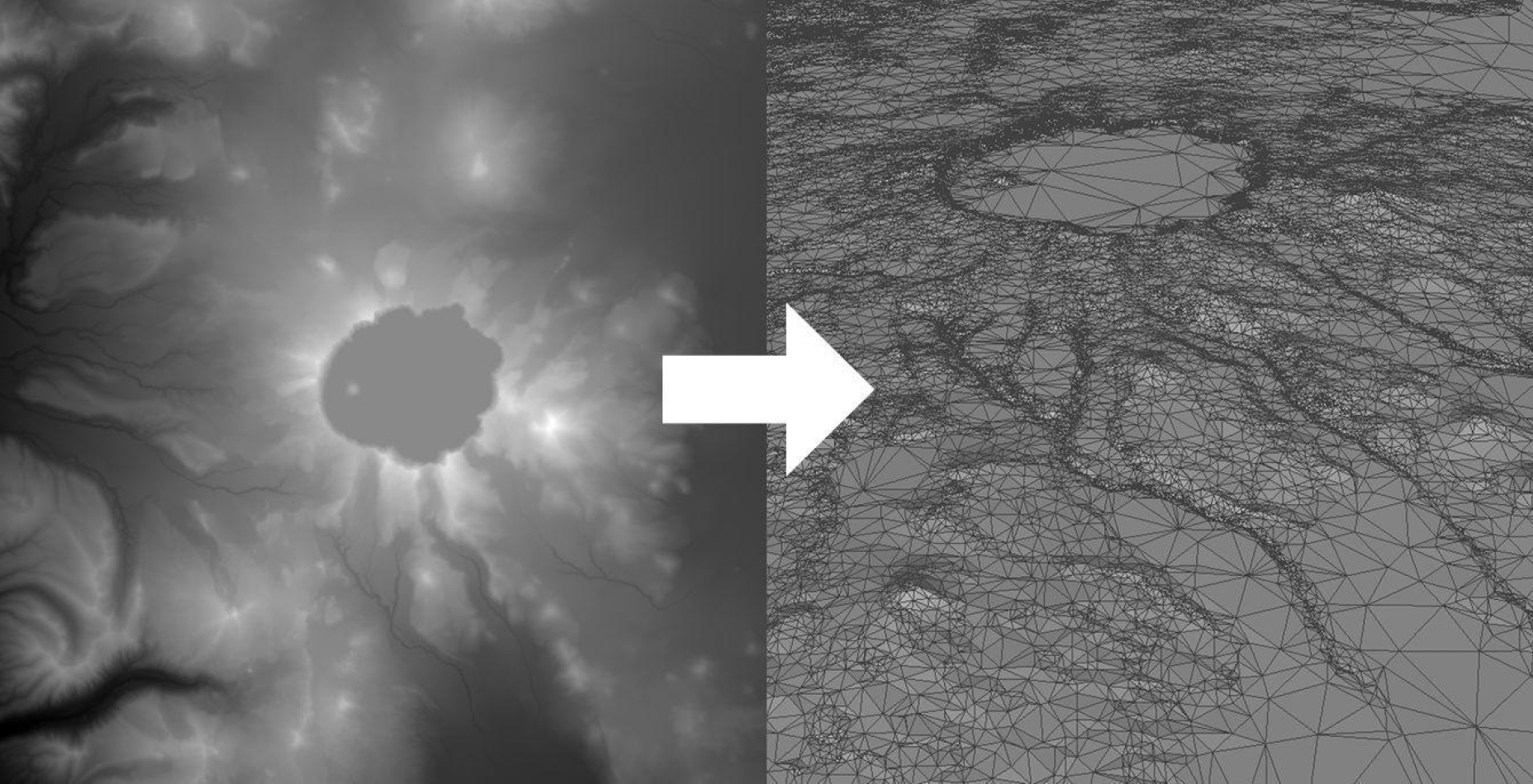 另一种较为激进的方法是不规则三角网(triangulated irregular network, TIN)。其核心思想是:放弃规则网格,针对地形特征进行非均匀采样:在平坦区域使用极大的三角形,在陡峭区域使用细碎三角形。