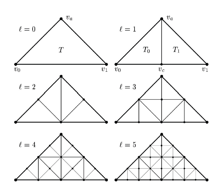 - 算法规定,每次细分必须从等腰直角三角形的斜边(最长边)中点进行剖分;这一刀切下去,会产生两个新的、面积减半的等腰直角三角形