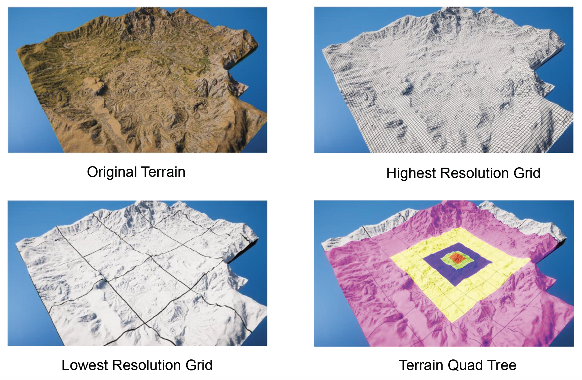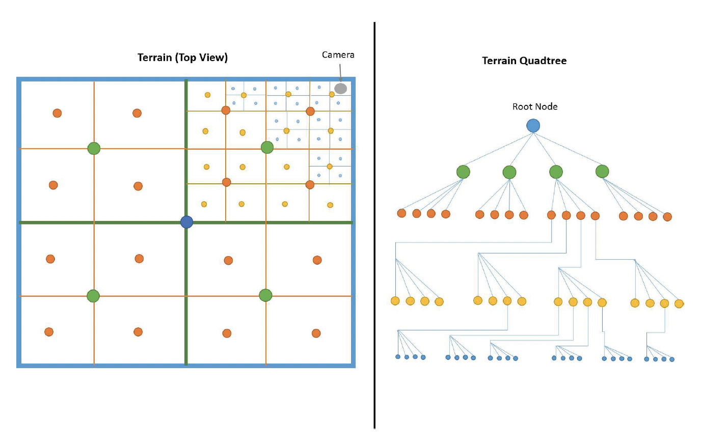 - 叶子节点对应实际渲染的最小图块 (tile),通常为 \(64 \times 64\) 或 \(128 \times 128\) 的网格