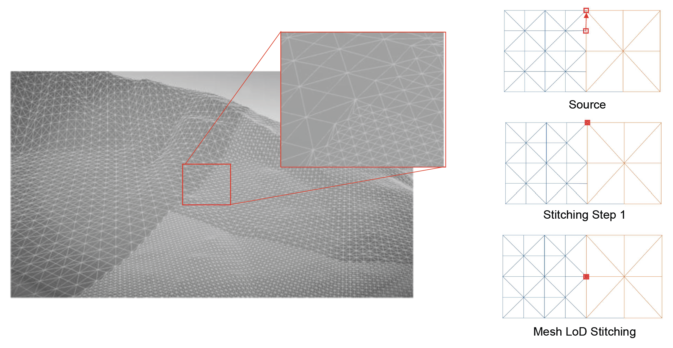 - 原理:当一个高精度的块(边缘有 N 个顶点)与一个低精度的块(边缘有 N/2 个顶点)相邻时,强制修改高精度块边缘顶点的索引缓冲区 (index buffer)。