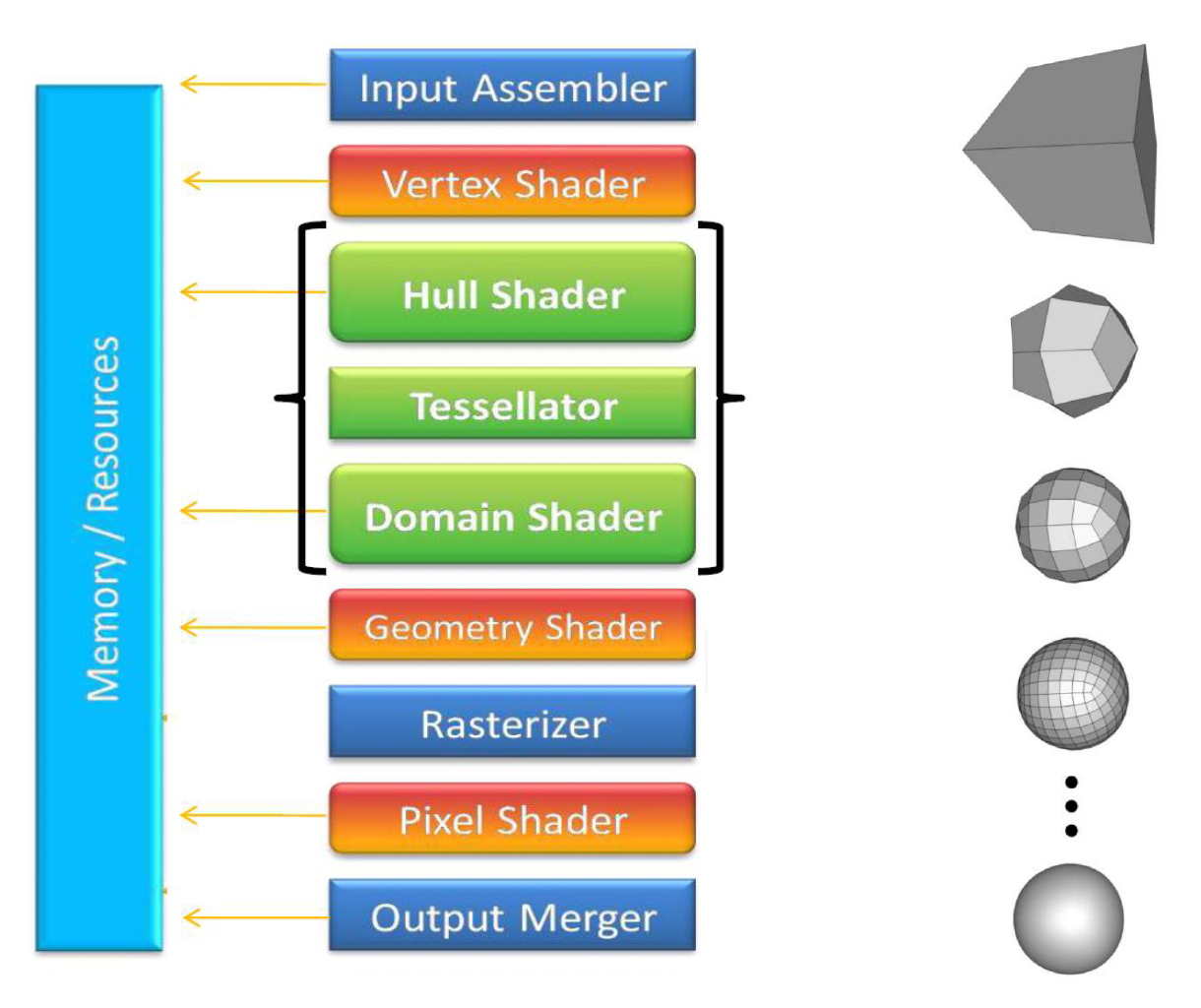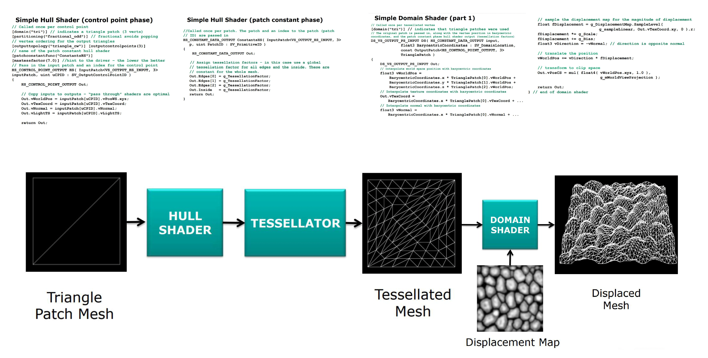 我们还可以利用现代 GPU 的力量,帮助我们更高效地完成地形曲面细分的任务。其中赫赫有名的便是 DX11 的三个阶段: