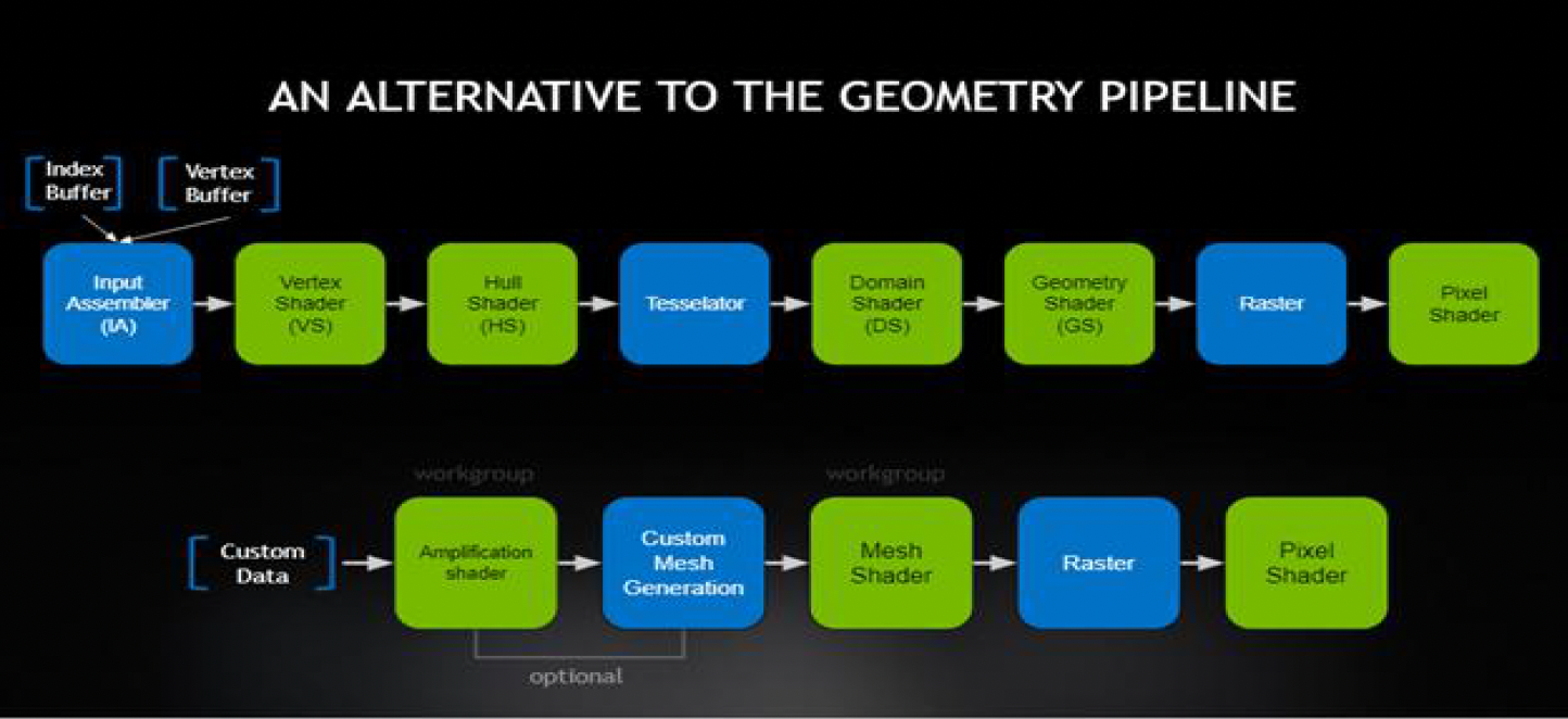 - 放大着色器(amplification shader) 阶段:决定运行多少个网格着色器组,并将数据传递给这些组