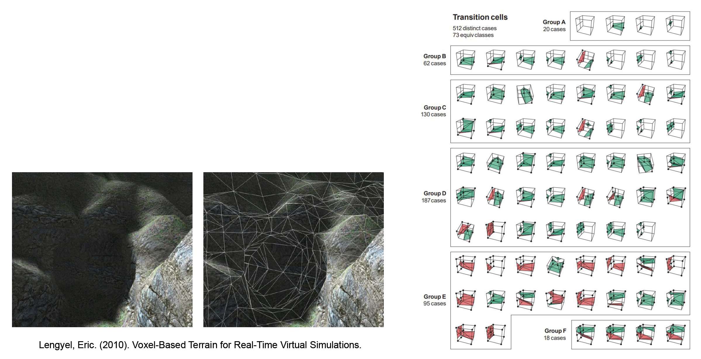 - 它预计算了复杂的过渡单元(transition cells)查找表,保证了多分辨率体素地形的水密性