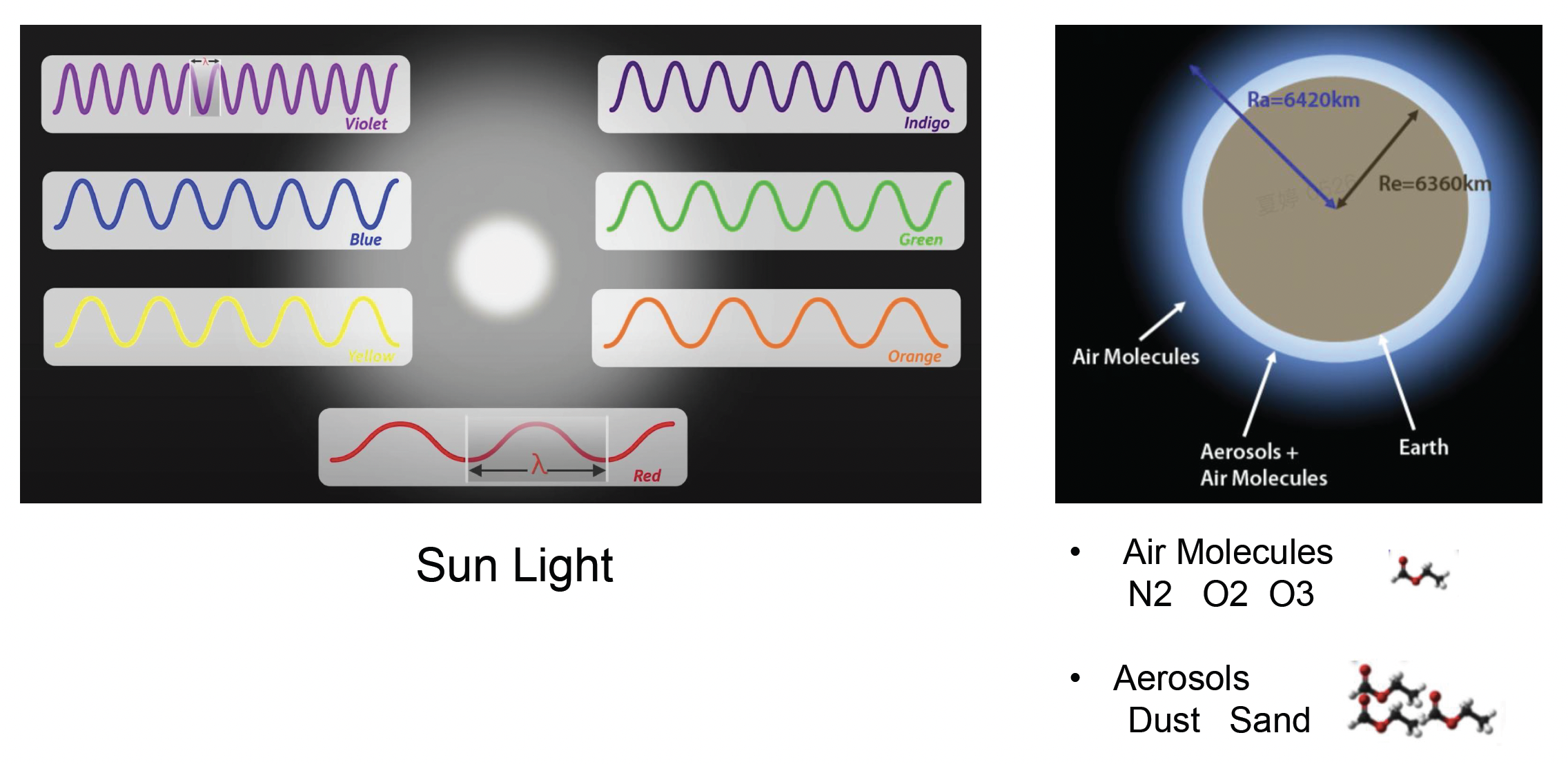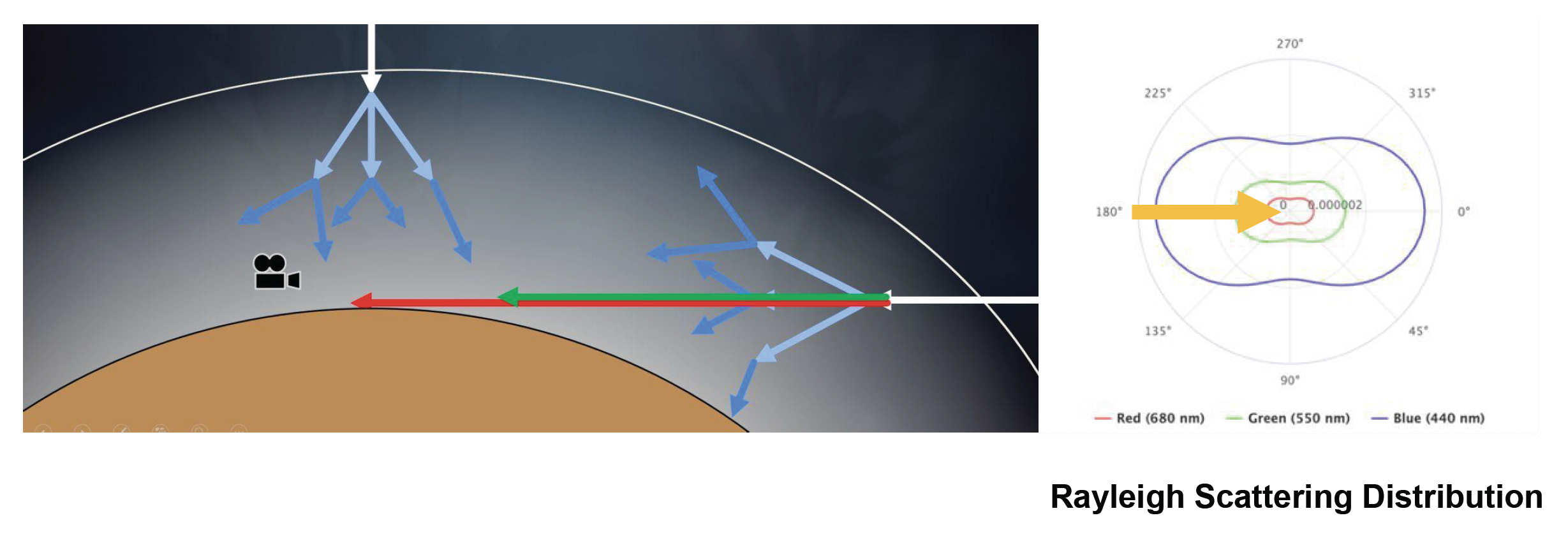 - 散射系数(scattering coefficient) \(\sigma_s^{\text{Rayleigh}} (\lambda, h) = \dfrac{8\pi^2(n^2 - 1)^2}{3} \dfrac{\rho(h)}{N} \dfrac{1}{\lambda^4}\)