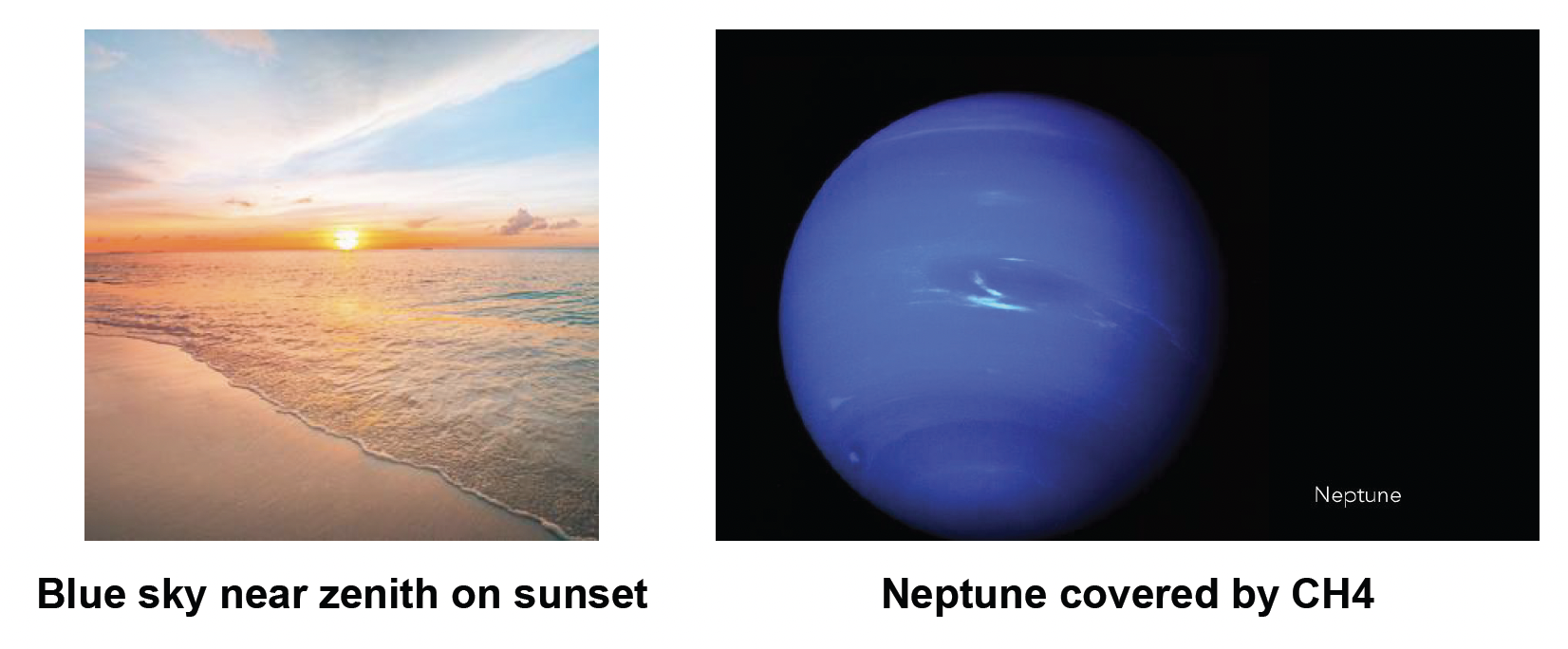 ) :同样知名于对红光的吸收(下图所示的海王星之所以看起来是蓝色的,正是因为其大气中的甲烷含量高)