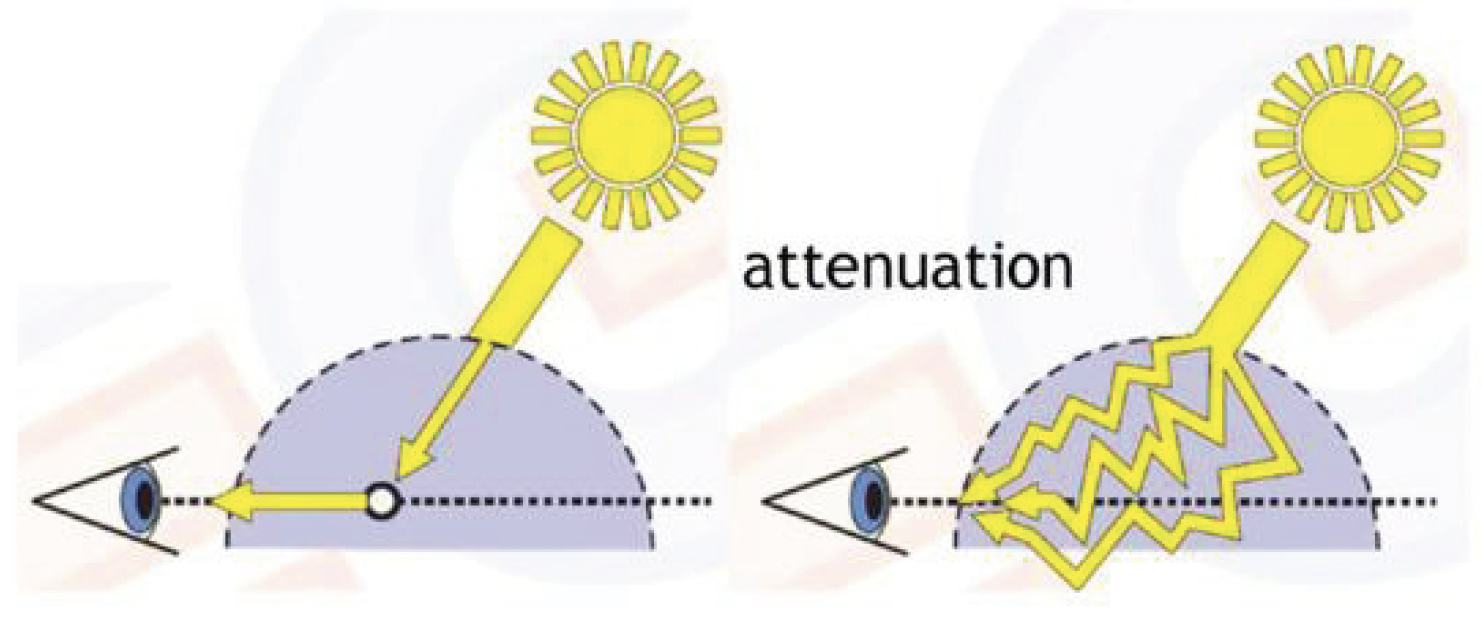多散射(multiple scattering):光可能在不同粒子间多次散射后才进入眼睛
