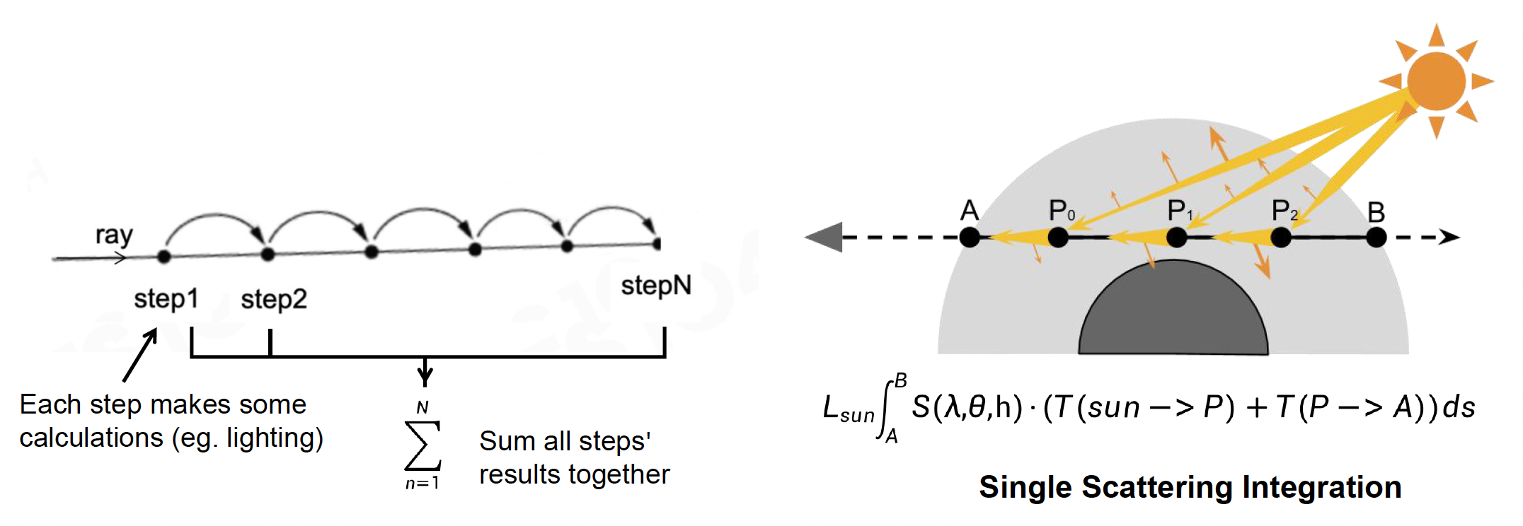 前面我们只介绍了各种用于渲染大气的方程,还没有讲过如何求解它们,所以下面就来介绍用于求解的技术。其中一种非常著名的算法是光线步进(ray marching)