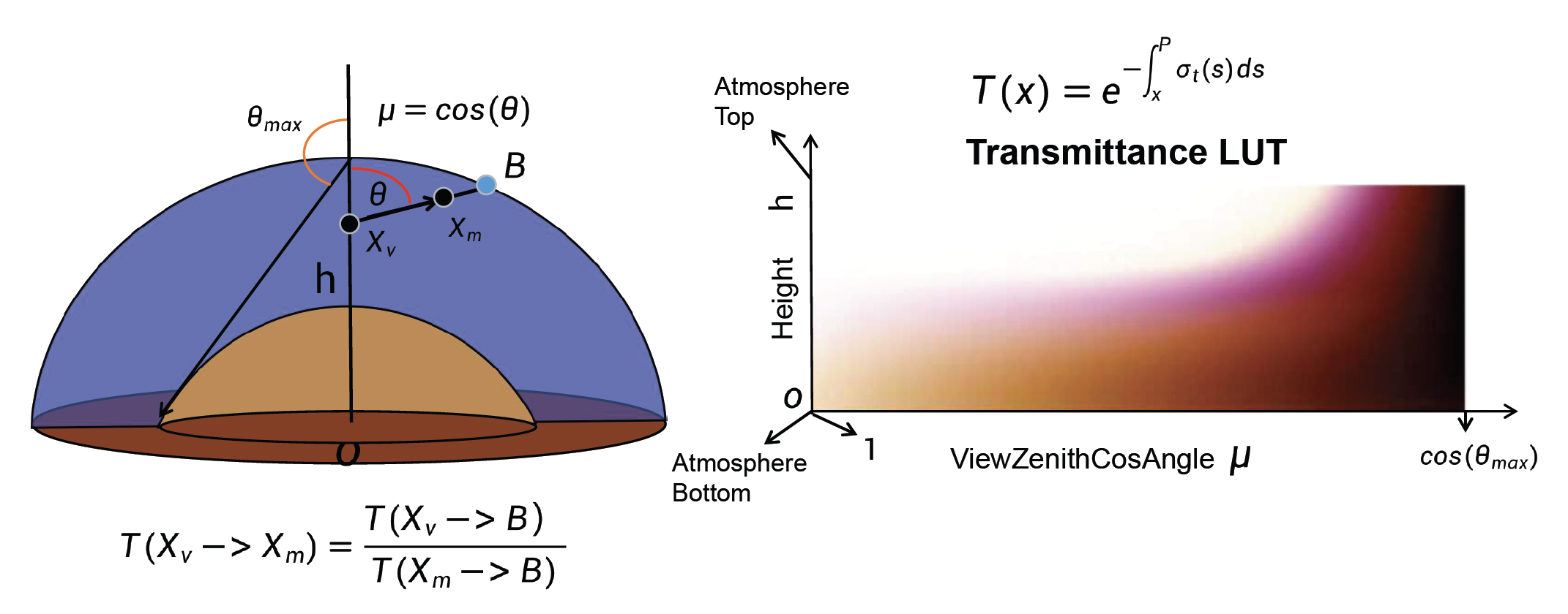 - 通过对不同视线距离积分吸收和散射损耗,生成一个二维表格,描述了从观察点到大气层边界的通透度分布