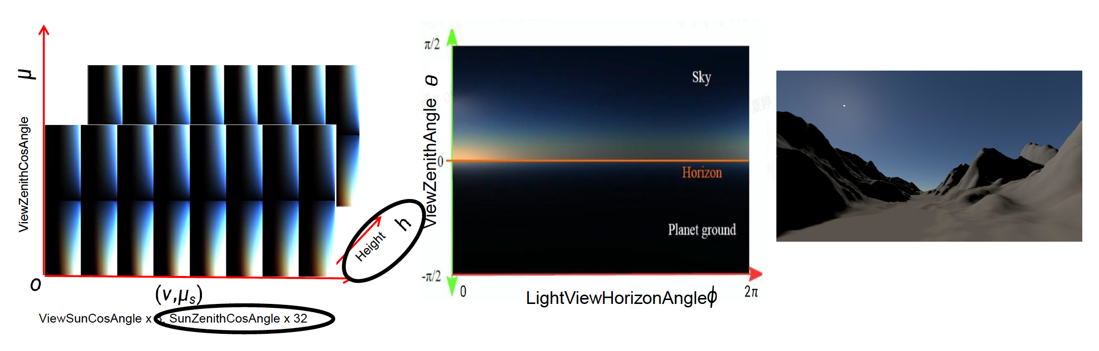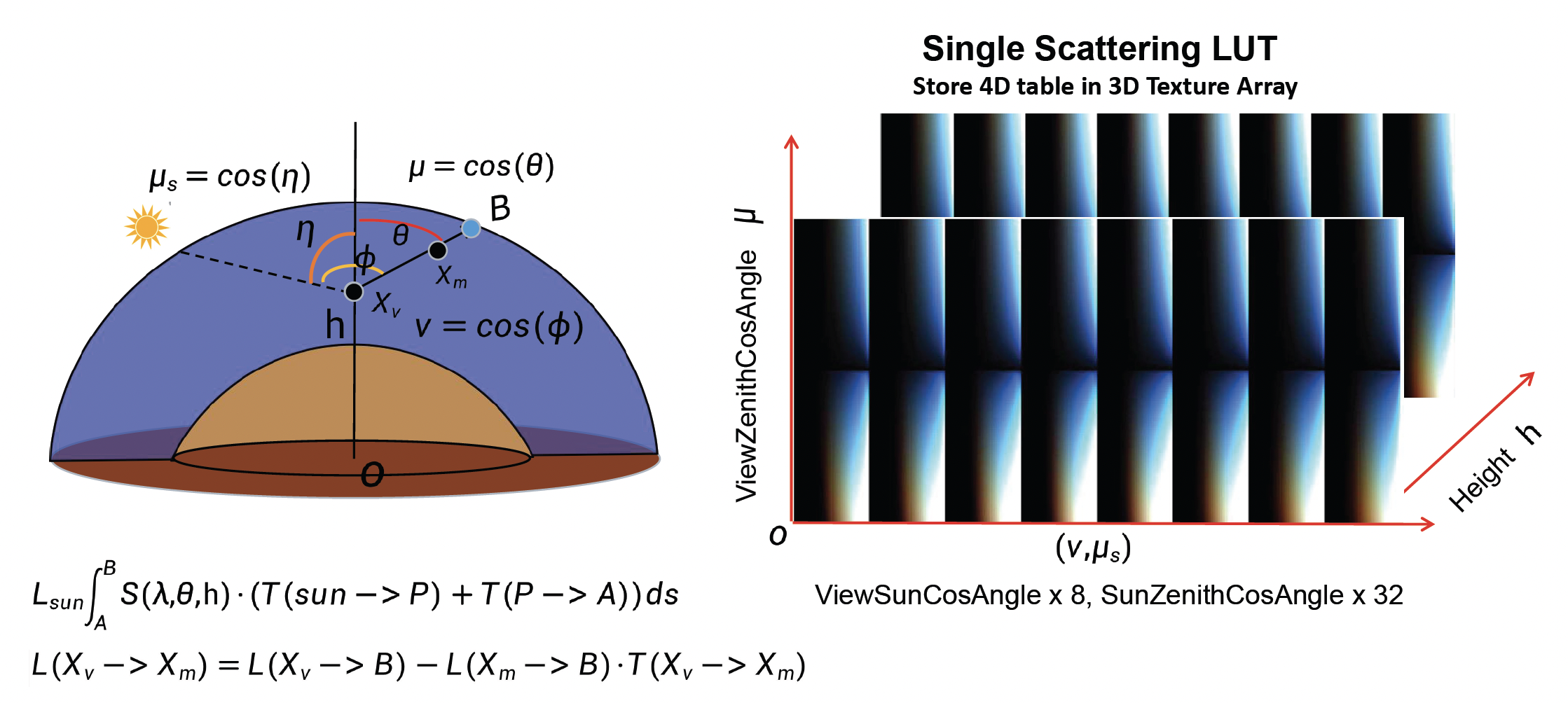 ) ,对每种组合采用光线步进,沿视线累积一次散射光强 - 虽然四维数据无法直接存储到 GPU 的标准纹理中,但开发者运用巧妙的参数化将其压缩为 3D 纹理:利用大气的球对称性质,将一些维度固定或合并