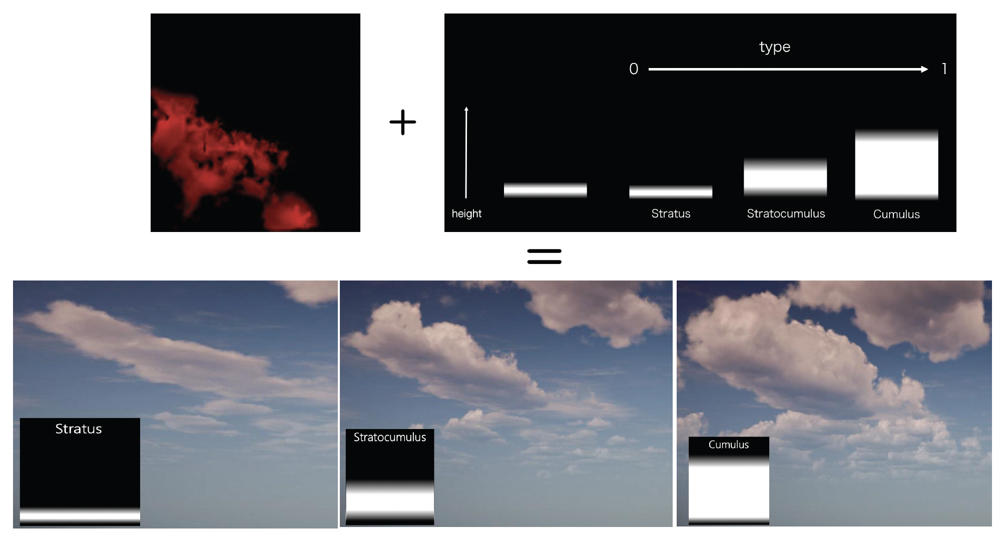 一个完整的云密度模型(cloud density model) 会用到上面这两个部分。其中对于基础的形状,使用低频噪声构建;而对于更多的细节,采用高频噪声勾勒。