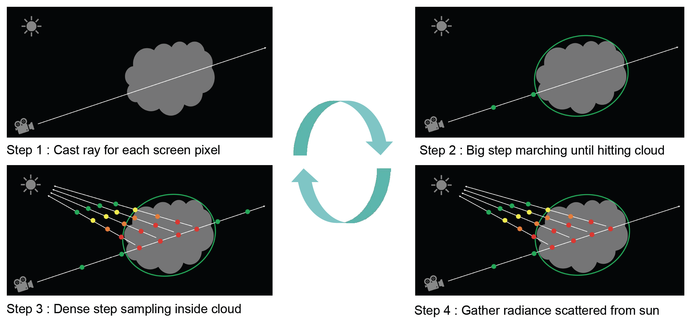 在渲染云的时候,我们依然可以采用前面介绍的光线步进算法。具体步骤如下: