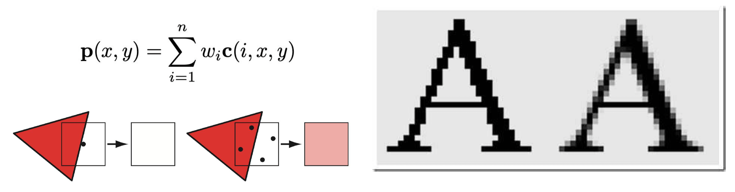 解决走样的办法就是反走样(anti-aliasing)。基于屏幕的反走样方案的总体策略是:使用一种采样模式来获取更多采样点,然后对采样点进行加权求和以产生像素颜色。