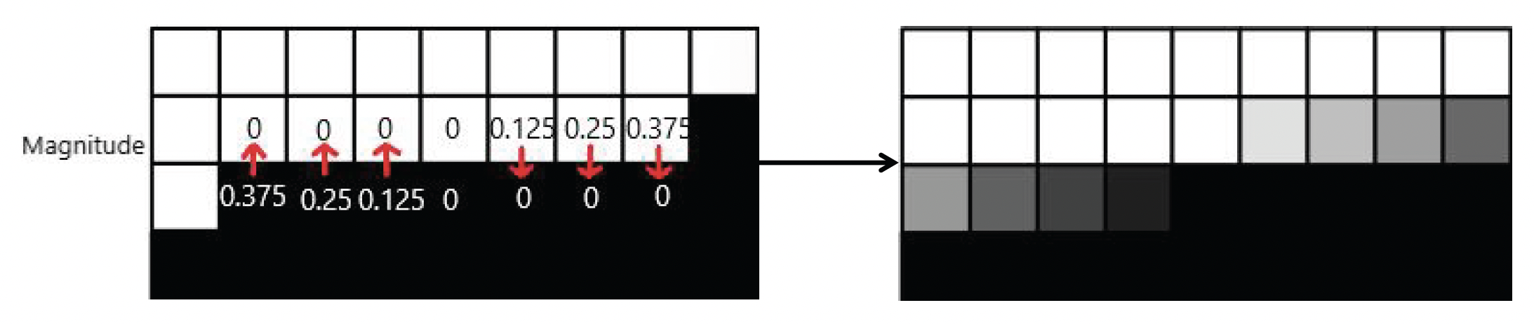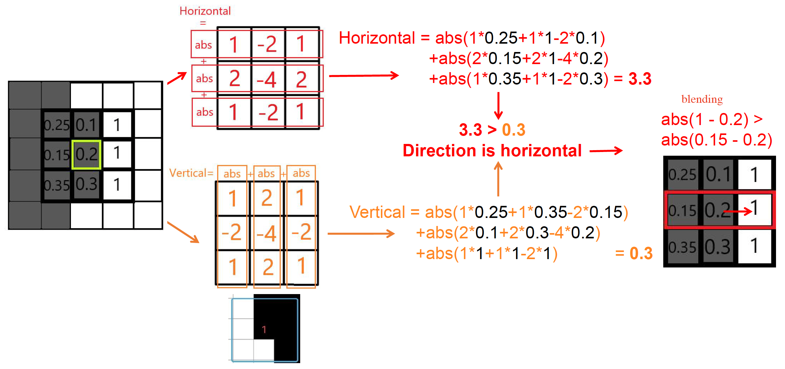 上图的例子中,通过计算法线横向变化更大些,并且中心像素和右邻居像素的差值更大,因此可以确定该像素的偏移量朝右。