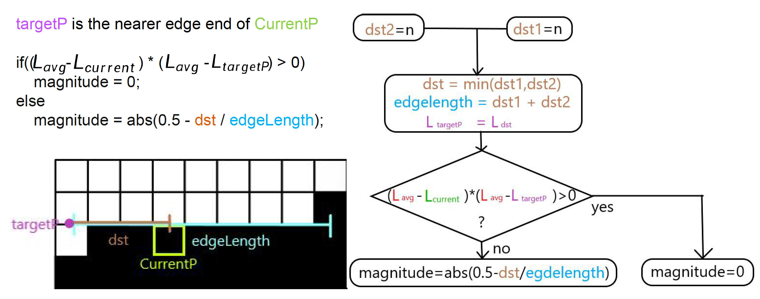 - 沿着 2 个垂直的(perpendicular) 方向搜索,计算平均亮度(\(L_{\text{edge}1n}, L_{\text{edge}2n}\))