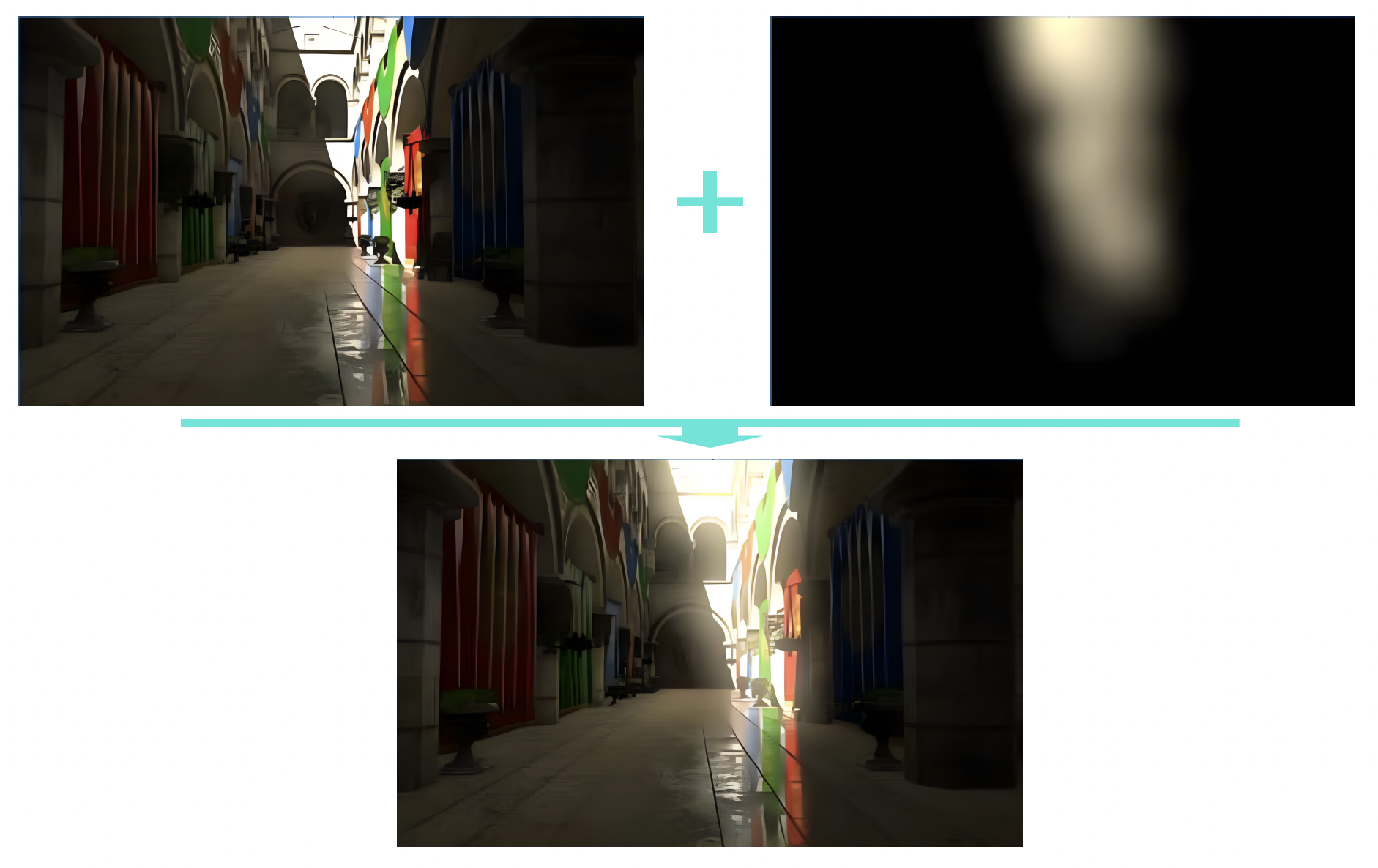 其中 \(W(\vec{\omega})\) 为衰减函数(attenuation function) \(\max(0, 1 - r(\theta) / R)\)。它的作用是对于离相机很远的物体,降低它对 AO 的贡献(避免出现像 SSAO+ 例子中的重影现象