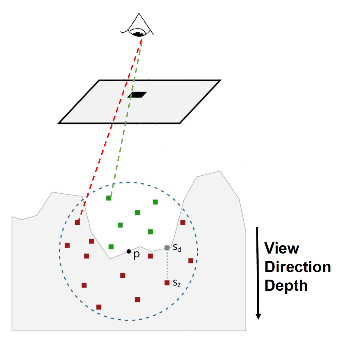 - 在以视图空间的每个像素点 p 为球心的球体上随机采样 N 个点